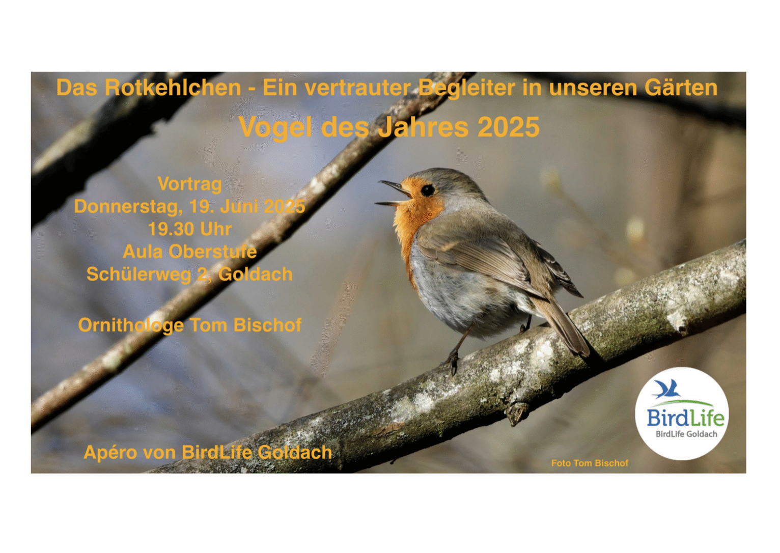 BirdLife Goldach lädt heute Abend zu einem interessanten Vortrag in die Aula Goldach ein: „Das Rotkehlchen – Ein vertrauter Begleiter“. Das «Rotbrüstli» ist mit seinem orangeroten Brustfleck, seiner runden Gestalt und den grossen Knopfaugen leicht zu erkennen. Durch sein oft neugieriges und vertrauensvoll wirkendes Auftreten erobert es schnell die Herzen der Menschen.