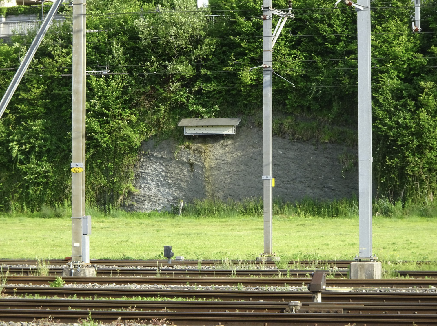 Eine zweite grosse Mauersegler-Kolonie befindet sich beim Hauptbahnhof. Als Ersatz für die abgebrochenen SBB-Baracken wurde dort an der Felswand im Frühjahr 2020 eine gedeckte Holzkonstruktion mit 27 Nisthilfen montiert. Erfreulicherweise haben die Segler diese sofort angenommen.