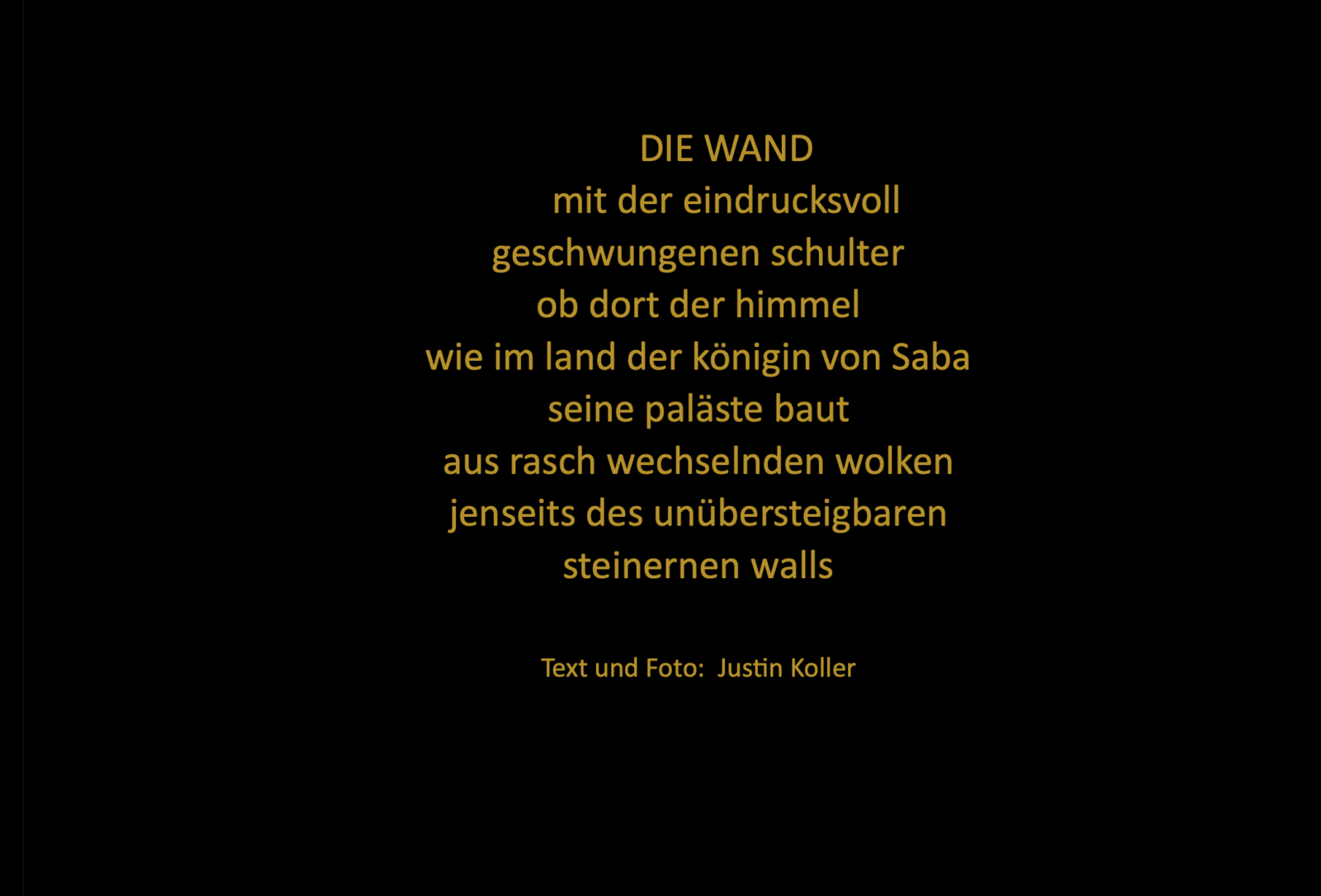 Justin Koller schreibt dazu: “Zu einem Text, der die Fantasie herausfordert, passt ein Foto, das bearbeitet wurde. Vom Stil her verwandt,entziehen sie sich beide vorerst einer klaren Interpretation. Dadurch wirkt der Text fremd und unverständlich, dann aber zunehmend einnehmend. Er spricht eine stille Sehnsucht an nach dem Unbekannten, dem Unerreichbaren – er hat etwas von einem modernen Märchen. Ein Autor sollte seinen Text besser nicht interpretieren! Deshalb entlasse ich ihn hier und lege ihn in deine Hände – gib ihm eine Chance! Ein Austausch wird mich sehr freuen!“ (Gestaltung: Eigenkreation Justin Koller)