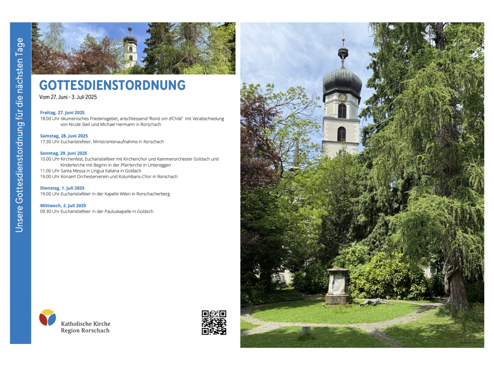 Gottesdienstordnung der KKRR für die nächsten TageThemen:Kath. RorschachKulturPartnerRegionRorschach 27. Juni 2025 - 05:20Gilt ab heute Freitag bis kommenden Mittwoch, 2. Juli 2025. Mehr Informationen finden Interessierte immer auch hier und hier.Teilen mit: Einen Link per E-Mail an einen Freund senden (Wird in neuem Fenster geöffnet) E-Mail Drucken (Wird in neuem Fenster geöffnet) Drucken Auf Facebook teilen (Wird in neuem Fenster geöffnet) Facebook Auf X teilen (Wird in neuem Fenster geöffnet) X Auf WhatsApp teilen (Wird in neuem Fenster geöffnet) WhatsApp Gefällt mir:Gefällt mir Wird geladen …Newsletter abonnieren Bitte dieses Feld leer lassenBitte wähle, ob Du über jeden neuen Beitrag sofort oder lieber jeden Morgen gegen 9 Uhr eine Zusammenfassung der neusten Beiträge erhalten möchtest.Liste(n) auswählen: Neues vom Echo (Zusammenfassung) Neues vom Echo (Sofortbenachrichtigung) Dieses Feld wird benötigt.Prüfen Sie Ihren Posteingang und den Spamordner, um Ihr Abonnement zu bestätigen.