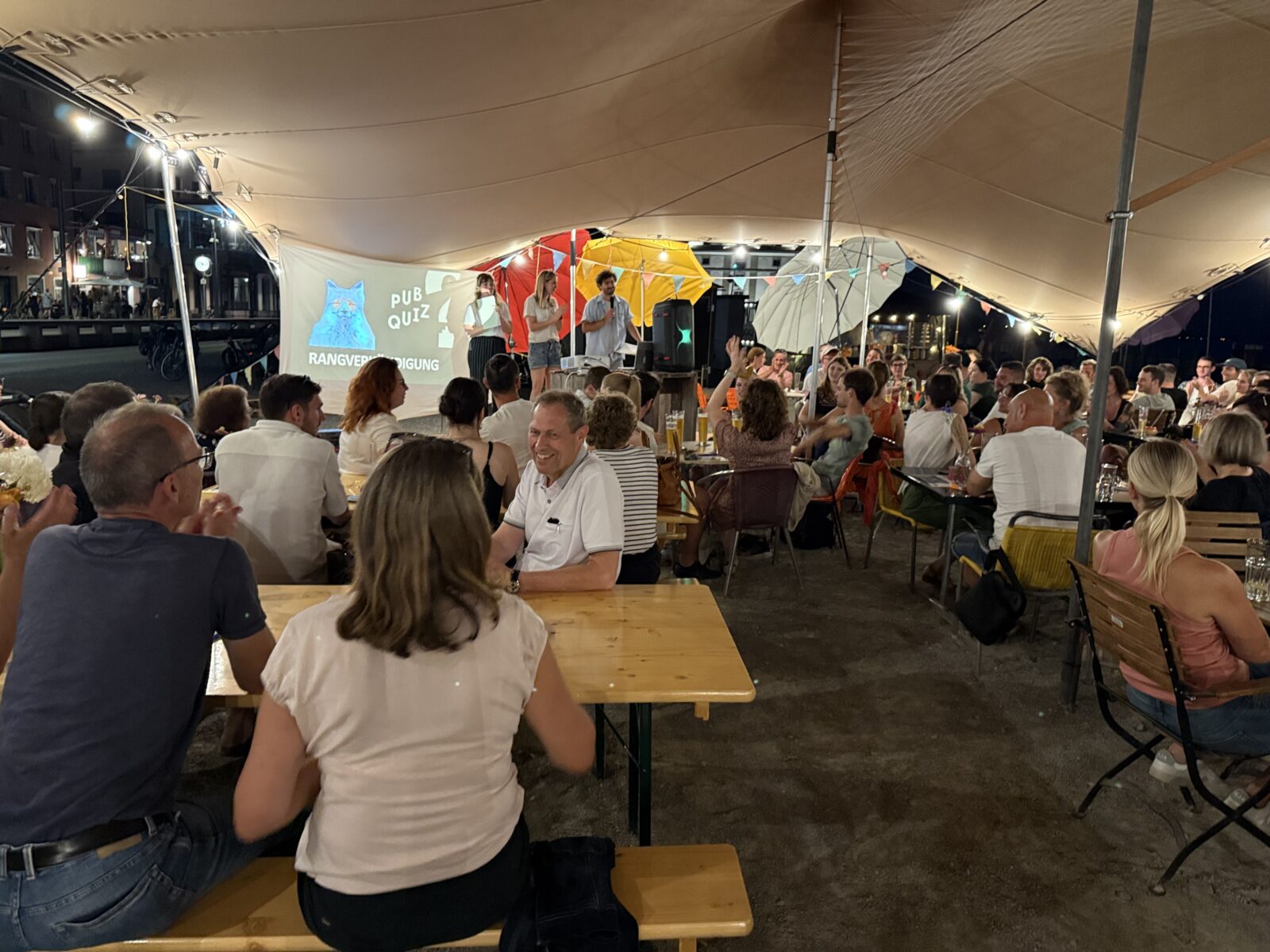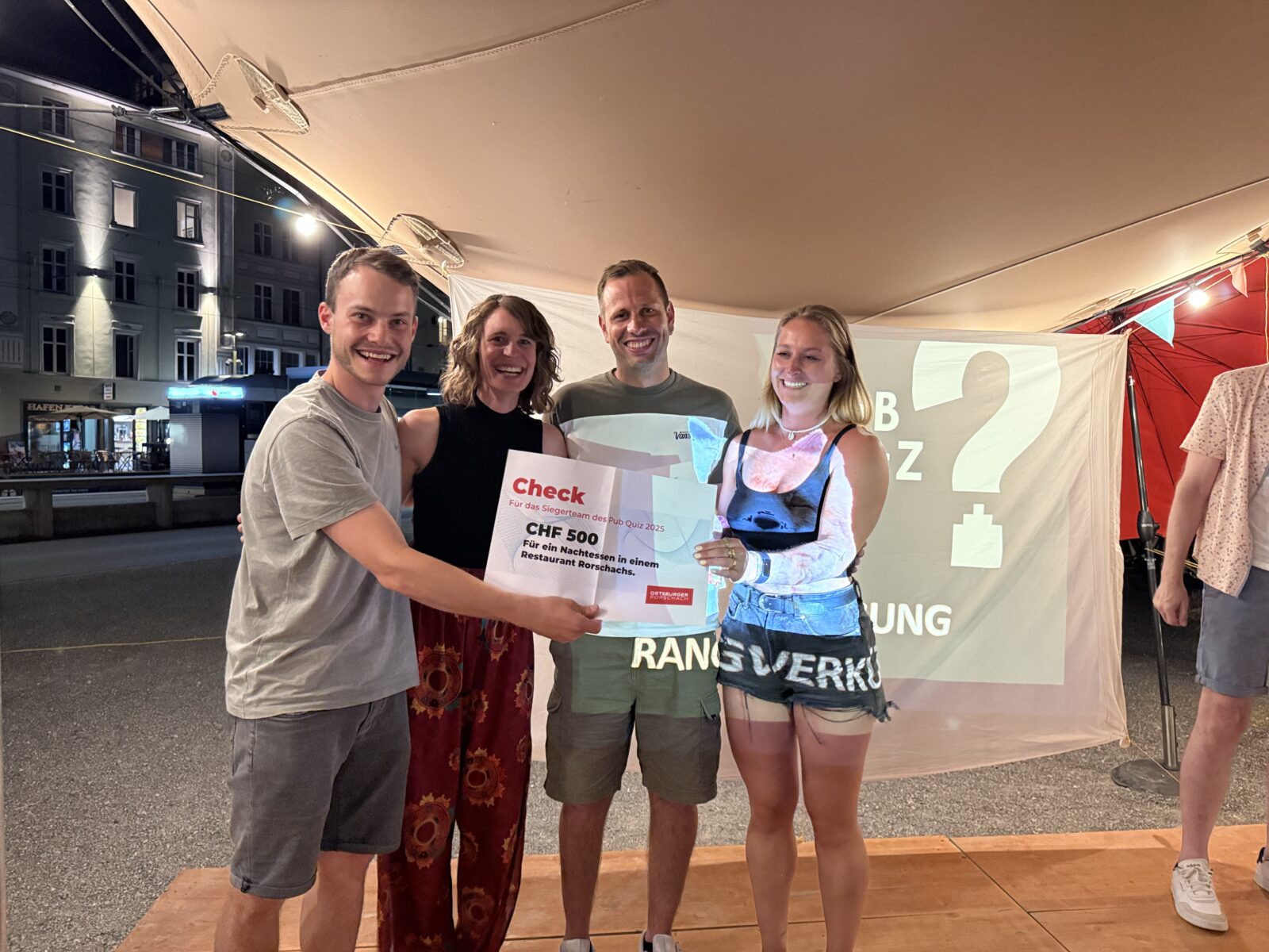 Gestern Abend haben die Ortsbürger Rorschach zum beliebten Pub Quiz ins Zelt-Werk Rorschach eingeladen. Nach dem grossen Erfolg im letzten Jahr organisierten sie einen weiteren Pub-Quiz im Zelt-Werk am Hafenplatz. Durch den Quiz-Abend führten erneut die drei bekannten Quiz-Füxe Vanessa Ledergerber, Melanie Pahud und Dario Cantieni, die jeweils auch das Pub Quiz im Treppenhaus moderieren. Die Fragen waren gestern etwas breiter gestellt und haben sich nicht nur um Rorschach gedreht. Am Schluss lag das Team „I gang go töffle“ mit total 57 Punkten ganz vorne und darf nun für satte 500 Franken auf Kosten der Ortsbürger Rorschach in einem Restaurant der Stadt dinieren. Grundsätzlich ging es gestern aber lediglich um Ruhm und Ehre. Hier einige Schnappschüsse von gestern Abend.