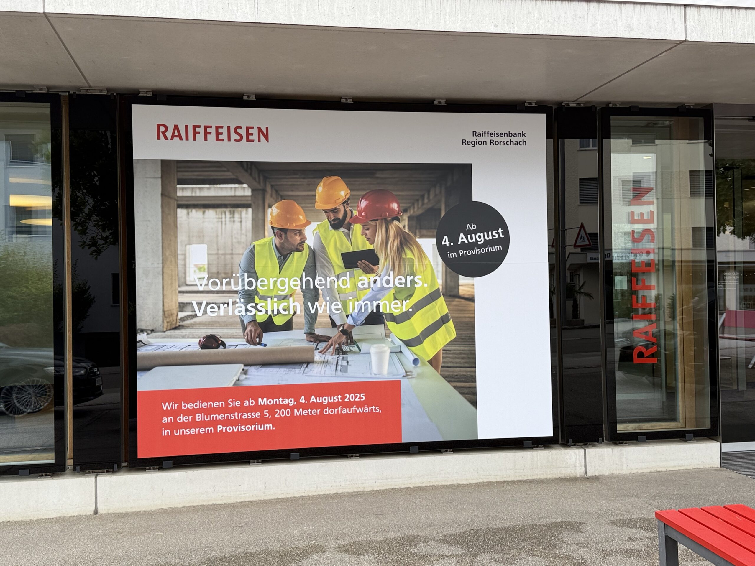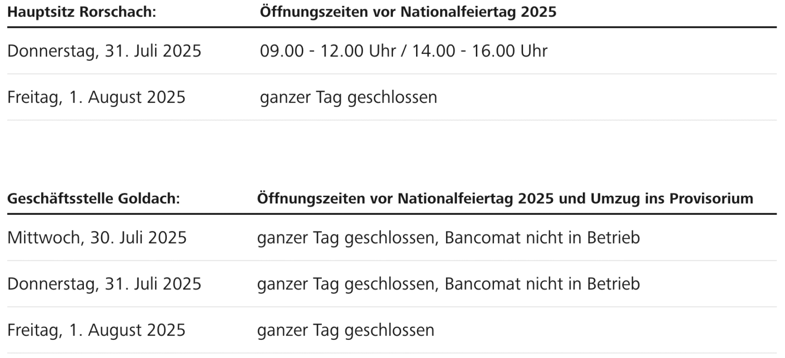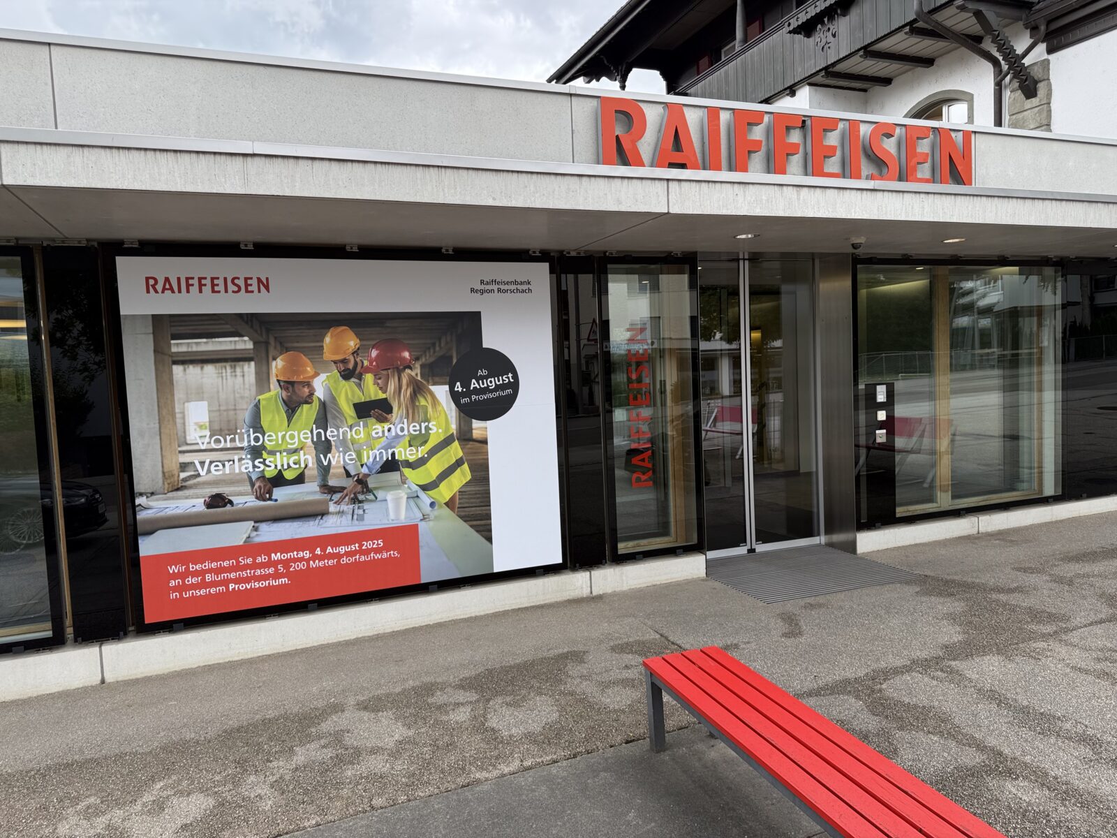 Die Raiffeisenbank der Region Rorschach informiert nachstehend zu den Öffnungszeiten rund um den Nationalfeiertag 2025 und den bevorstehenden Umzug ins Provisorium in Goldach.