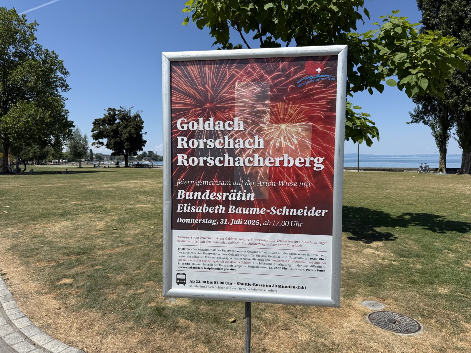 Die drei Gemeinden Goldach, Rorschach und Rorschacherberg laden am Donnerstag, 31. Juli 2025, zur regionalen Bundesfeier auf der Arion-Wiese in Rorschach ein. Nach dem wetterbedingten Abbruch im letzten Jahr steht diese Ausgabe ganz im Zeichen des Neuanlaufs – mit demselben, hochkarätigen Ehrengast: Bundesrätin Elisabeth Baume-Schneider, die vor einem Jahr bereits angereist war, hält ihre spontane Zusage von damals ein und wird in diesem Jahr ihre Ansprache zum Nationalfeiertag nachholen.