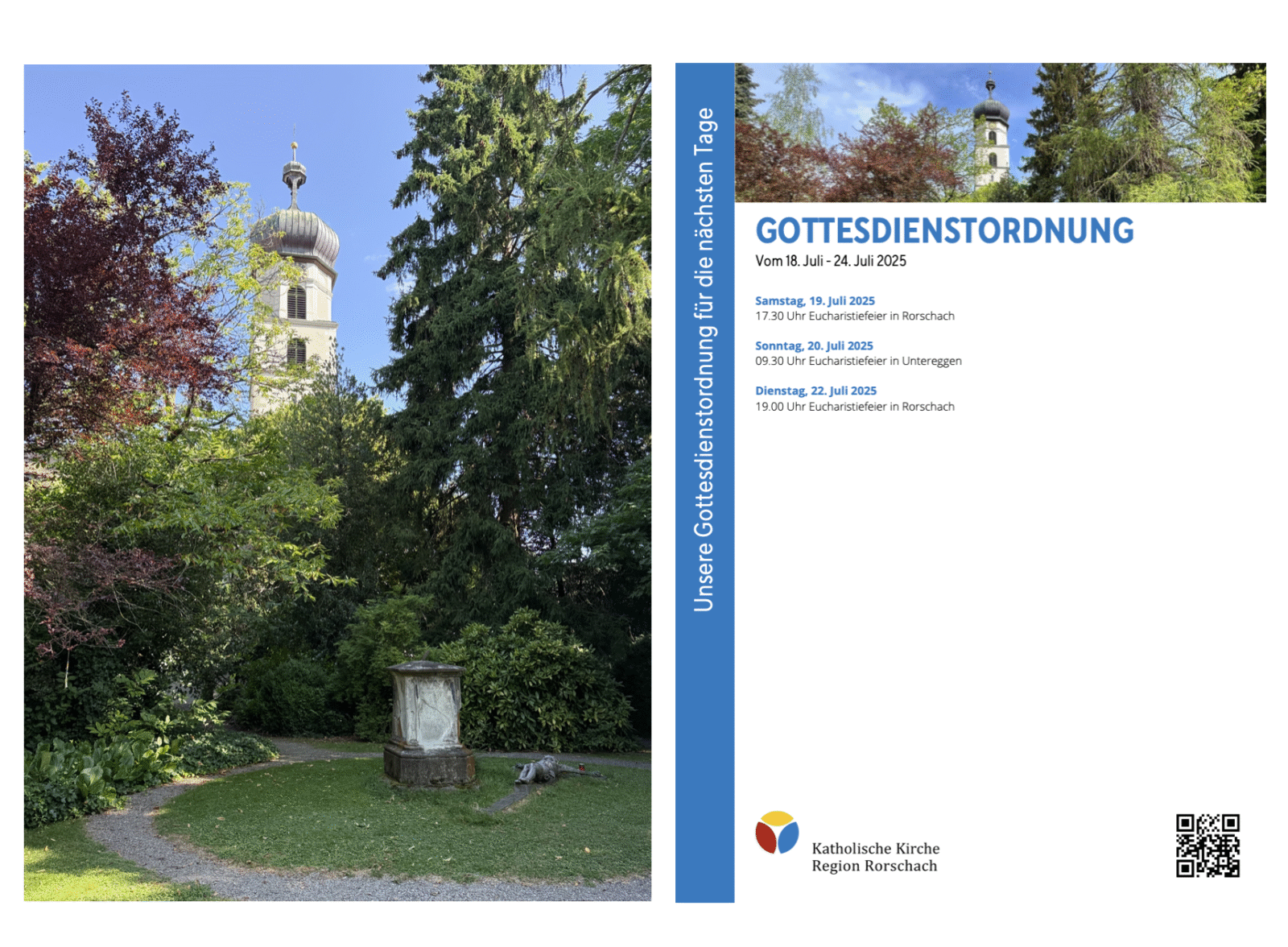 Gottesdienstordnung der KKRR für die nächsten TageThemen:Kath. RorschachKulturPartnerRegionRorschach 18. Juli 2025 - 05:15Gilt ab morgen Samstag bis kommenden Dienstag, 22. Juli 2025. Mehr Informationen finden Interessierte immer auch hier und hier.Teilen mit: Klicken, um einem Freund einen Link per E-Mail zu senden (Wird in neuem Fenster geöffnet) E-Mail Klicken zum Ausdrucken (Wird in neuem Fenster geöffnet) Drucken Klick, um auf Facebook zu teilen (Wird in neuem Fenster geöffnet) Facebook Klicke, um auf X zu teilen (Wird in neuem Fenster geöffnet) X Klicken, um auf WhatsApp zu teilen (Wird in neuem Fenster geöffnet) WhatsApp Gefällt mir:Gefällt mir Wird geladen …Newsletter abonnieren Bitte dieses Feld leer lassenBitte wähle, ob Du über jeden neuen Beitrag sofort oder lieber jeden Morgen gegen 9 Uhr eine Zusammenfassung der neusten Beiträge erhalten möchtest.Liste(n) auswählen: Neues vom Echo (Zusammenfassung) Neues vom Echo (Sofortbenachrichtigung) Dieses Feld wird benötigt.Prüfen Sie Ihren Posteingang und den Spamordner, um Ihr Abonnement zu bestätigen.