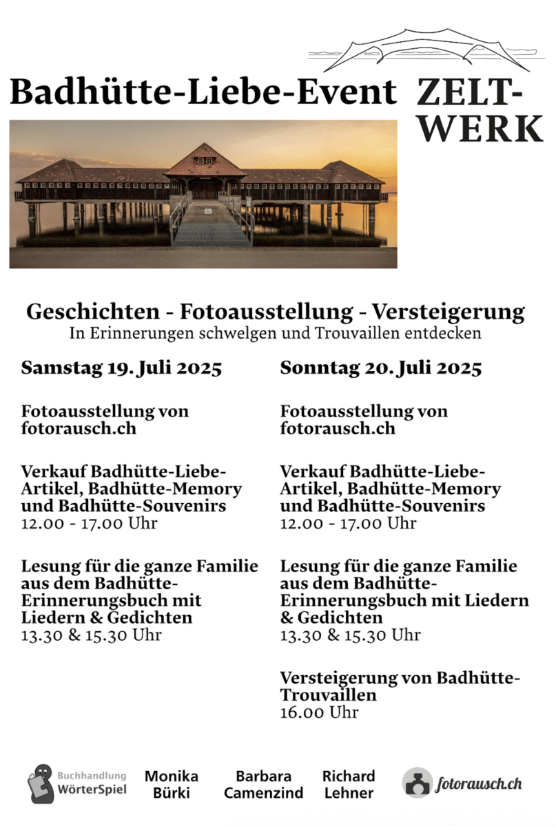 Kim und Michèle schreiben: „Dieses Wochenende schwelgen wir in Erinnerung an unsere Badhütte Rorschach (12-17 Uhr) – mit Bilderausstellung von fotorausch.ch, Badhütte-Memory von Monika Bürki und vielen tollen Badhütte-Liebe-Artikeln vom WörterSpiel. Lesung für die ganze Familie aus dem Badhütte-Erinnerungsbuch mit Liedern und Gedichten: jeweils 13:30 und 15:30 Uhr. Für Hungrige: Malathy kocht für uns Köstlichkeiten aus Sri Lanka. Und natürlich gibts hausgemachte Gelati von Bongusto.“