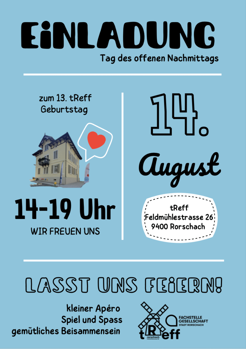 Lasst uns feiern, seit 13 Jahren gibt es in Rorschach einen Treffpunkt für Begegnung und Austausch! Es gibt einen kleinen Apéro, Spiel und Spass und gemütliches Beisammensein.