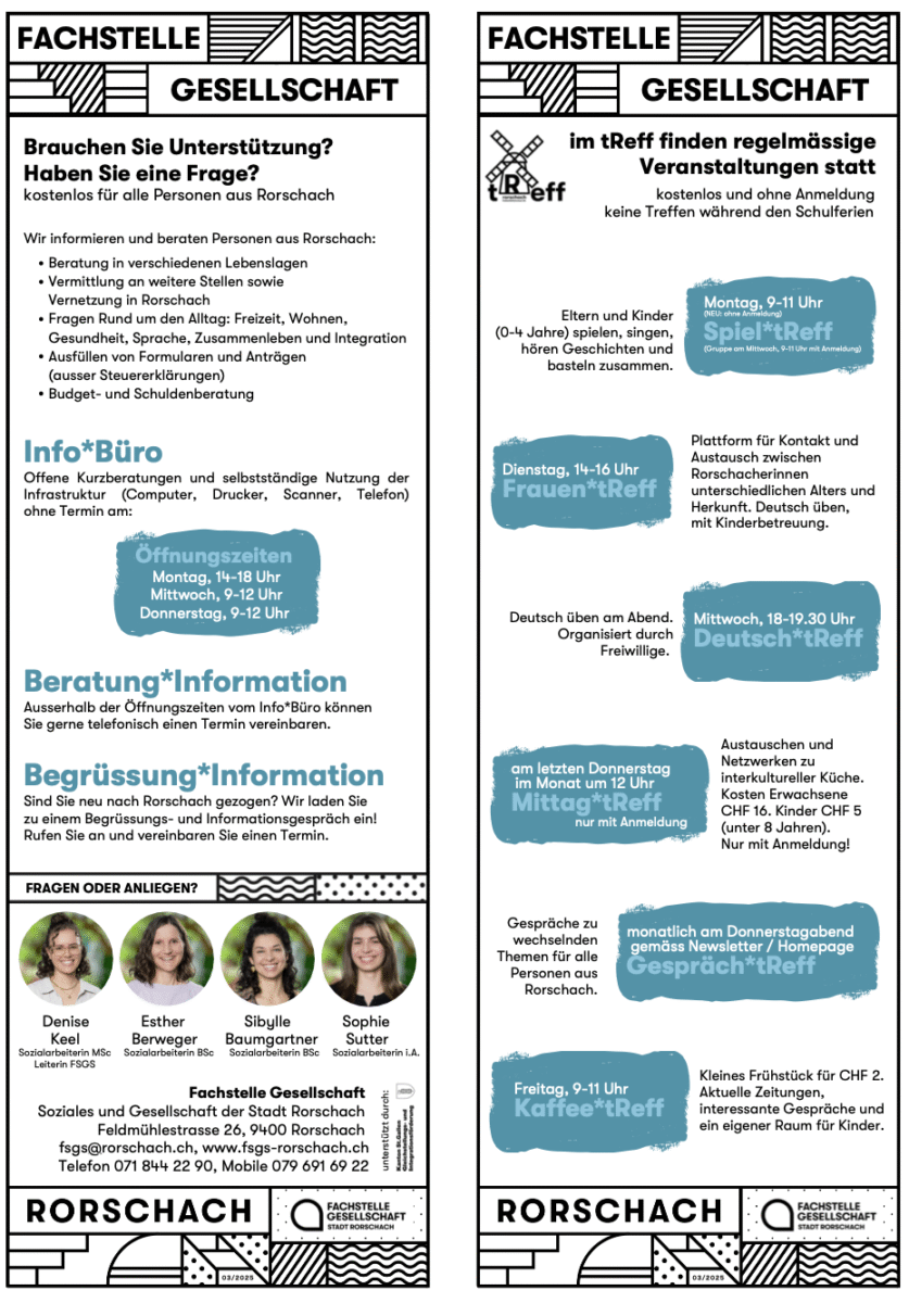 „Wir unterstützen Personen aus Rorschach kostenlos bei folgenden Themen: Beratung in verschiedenen Lebenslagen / Vermittlung an weitere Stellen sowie Vernetzung in Rorschach / Fragen Rund um den Alltag: Freizeit, Wohnen, Gesundheit, Sprache, Zusammenleben und Integration / Ausfüllen von Formularen und Anträgen (ausser Steuererklärungen) / Budget- und Schuldenberatung.