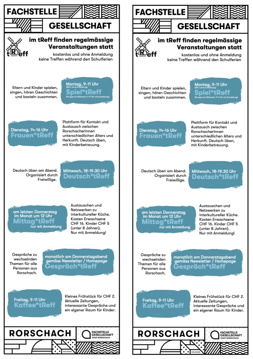 Während die Veranstaltungen im tReff in den Schulsommerferien bis am 8. August pausieren, bleibt das Büro der Fachstelle Gesellschaft wie gewohnt offen. Die Fachstelle schreibt dazu: