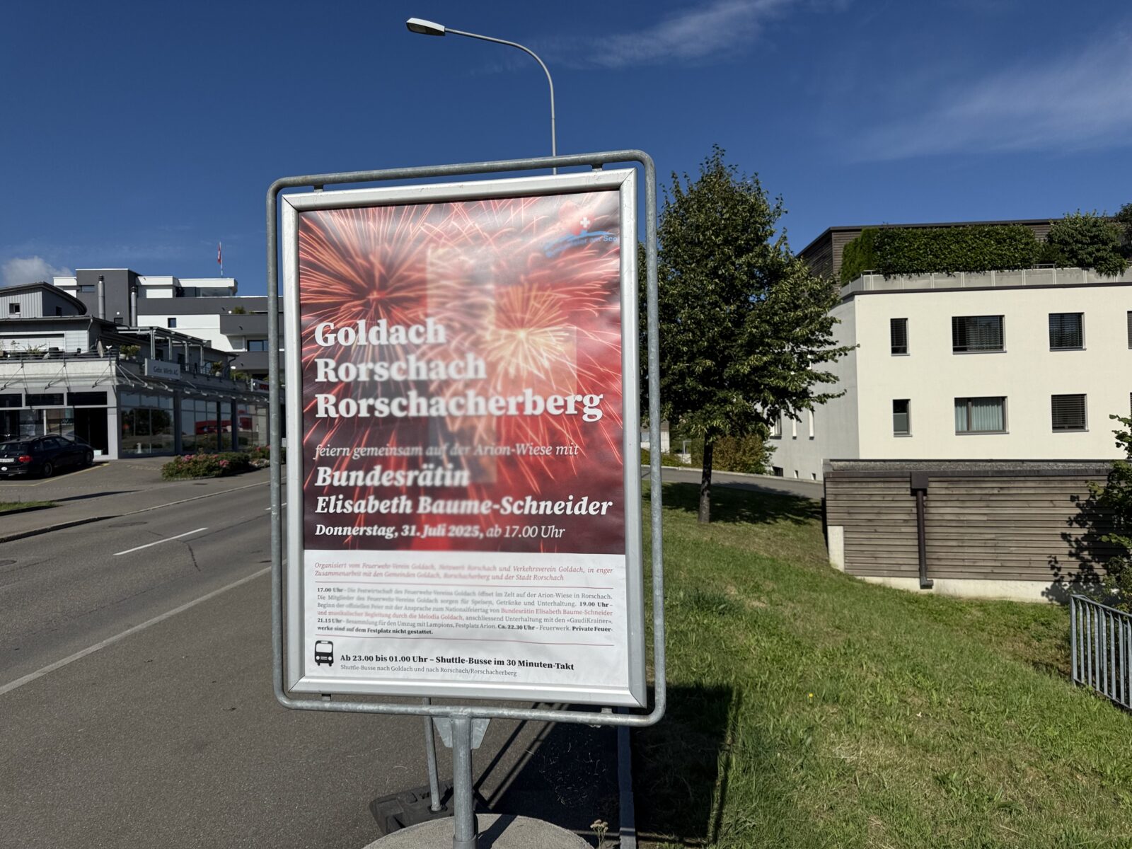 Die drei Gemeinden Rorschach, Goldach und Rorschacherberg laden kommenden Donnerstag, 31. Juli 2025, zur regionalen Bundesfeier auf der Arion-Wiese in Rorschach ein. Nach dem wetterbedingten Abbruch im letzten Jahr steht diese Ausgabe ganz im Zeichen des Neuanlaufs – mit demselben, hochkarätigen Ehrengast: Bundesrätin Elisabeth Baume-Schneider, die vor einem Jahr bereits angereist war, hält ihre spontane Zusage von damals ein und wird in diesem Jahr ihre Ansprache zum Nationalfeiertag nachholen.