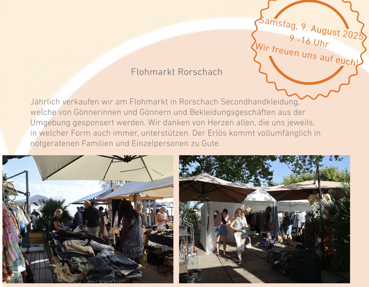 Heute treffen sich die CF-Frauen bereits um 6.00 Uhr im Pavillon und starten mit Zeltaufstellen, Bus ausladen und transportieren die Ständer vom Kornhaus an den Stand. Und für den Rest sind dann die Besucherinnen und Besucher des schönsten Flohmarkts der Stadt zuständig. An diesem Stand kann man mit einem Kauf Gutes für die Region bewirken.