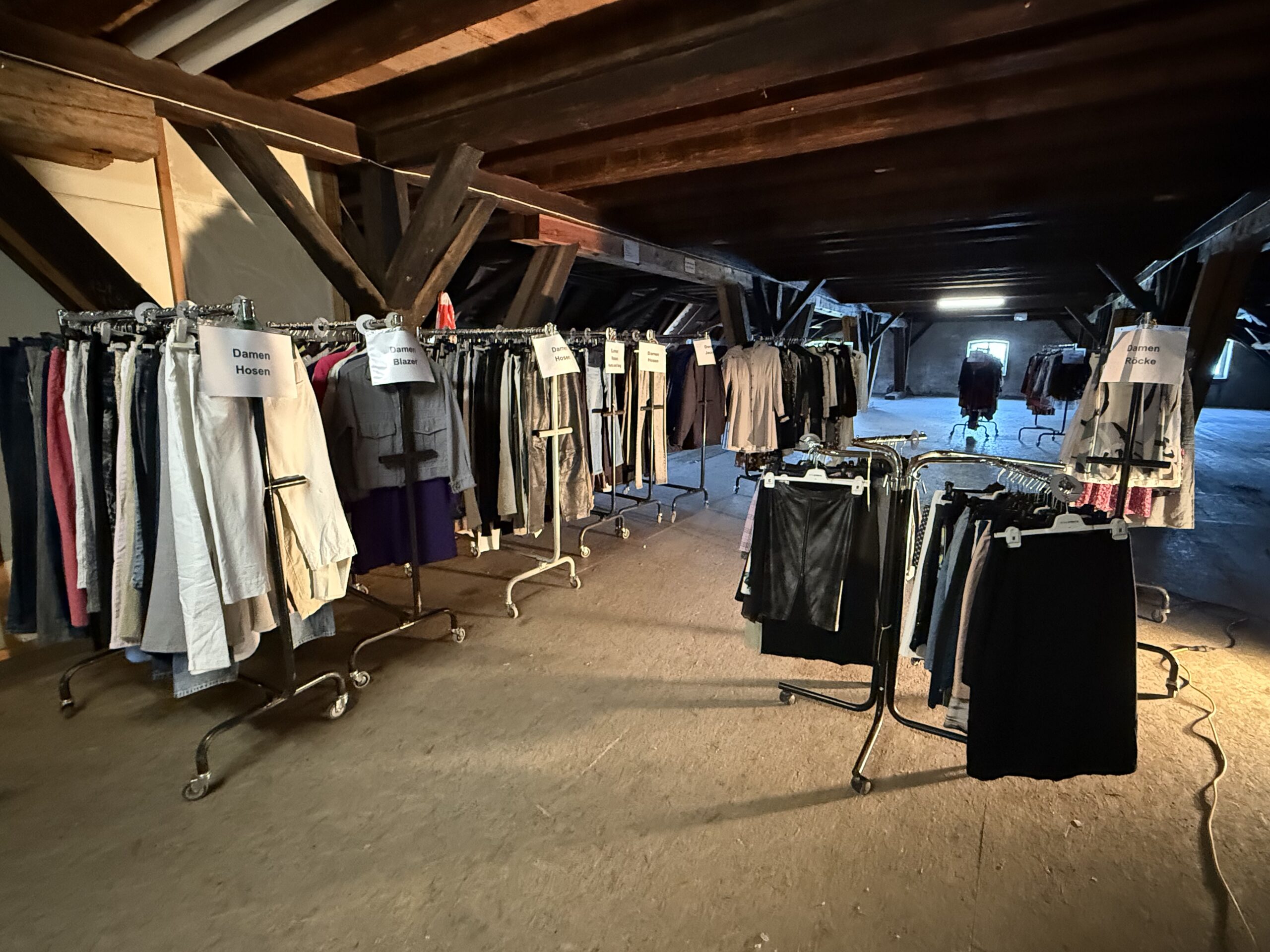 Heute ebenfalls am Flohmarkt vertreten ist der CF Rorschach. Hier Fotos von gestern Nachmittag. Sie zeigen, wie die CF Frauen im Kornhaus die Kleider für den heutigen Flohmi bereitgestellt haben. Ihren Stand findet man heute unmittelbar beim Pavillon-Kiosk. Insgesamt haben sie 23 Ständer vom C&A gefüllt mit Kleidern zur Auswahl und Heiri Kägi wird für sie zusätzlich vier Stände für Tshirts, Pullover, Schuhe, Taschen, Rucksäcke, Hüte, Schals etc. für Damen und Herren bereitstellen.