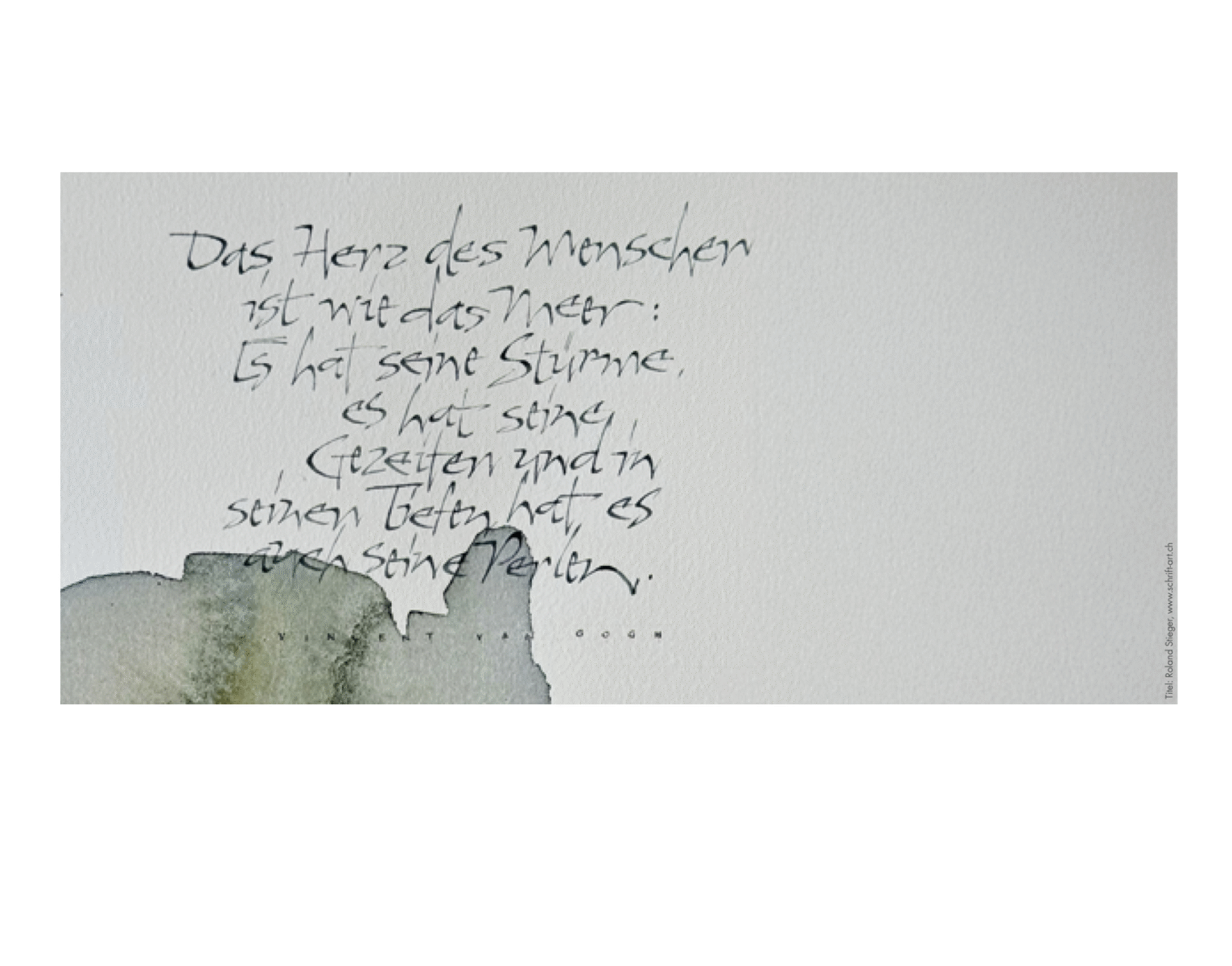 In Schauvitrinen werden Blätter über die Schriftgeschichte und eine kleine Ausstellung über Schreibwerkzeuge und die Tintenherstellung gezeigt. Für Fragen zur Kunst der Kalligraphie sind jeweils Mitglieder der SKG anwesend. Mehr zu dieser Gastausstellung finden Interessierte auch hier. (Beitragsbild: Roland Stieger, www.schrift-art.ch)