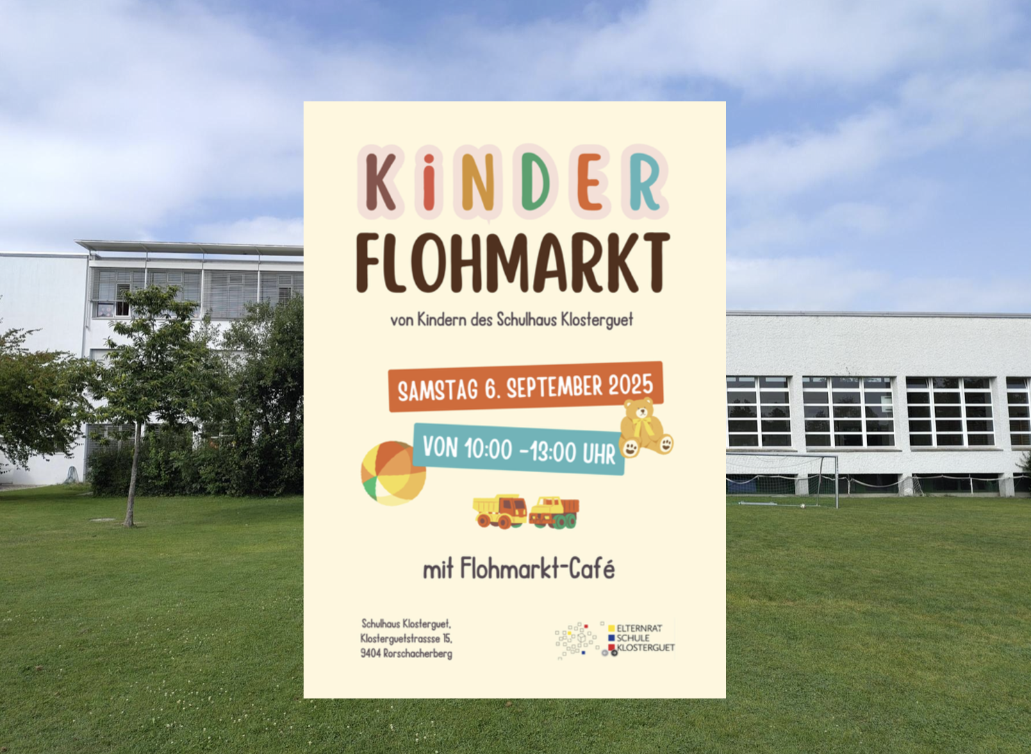 Am Samstag, 6. September 2025, findet auf dem Schulareal des Schulhauses Klosterguet ein Kinder-Flohmarkt statt – organisiert vom Elternrat der Schule. Die Kinder betreiben ihre eigenen Verkaufsstände und sammeln dabei erste Erfahrungen im Handeln und im Umgang mit Geld. Sie übernehmen Verantwortung, entwickeln Selbstvertrauen und erleben, wie schön es ist, etwas aus eigener Initiative zu schaffen. Ausserdem fördert der Anlass das Gemeinschaftsgefühl – innerhalb der Schule und mit Familien aus der Umgebung. Für Besucherinnen und Besucher ist es eine tolle Gelegenheit, gemeinsam mit ihren Kindern zu stöbern, zu handeln und den Vormittag in geselliger Atmosphäre zu geniessen. (Text/Flyer/Foto: pd shk ss)