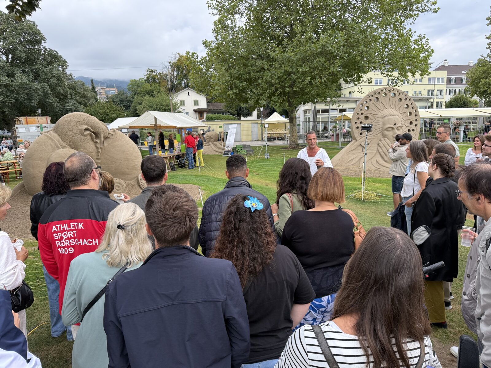 Gestern Abend hat die Stadt Rorschach die neu zugezogenen Rorschacherinnen und Rorschacher zu einem kleinen Willkommensanlass ins Sandskulpturen Festival auf die Arionwiese eingeladen. Stadtpräsident Röbi Raths durfte 126 Personen begrüssen, die sich dann auch noch von Festival-Leiter Urs Koller durch die Sandskulpturen führen liessen. Zudem haben einige Vereine die Chance genutzt, direkt vor Ort auf sich aufmerksam zu machen. Hier einige Schnappschüsse von gestern Abend.