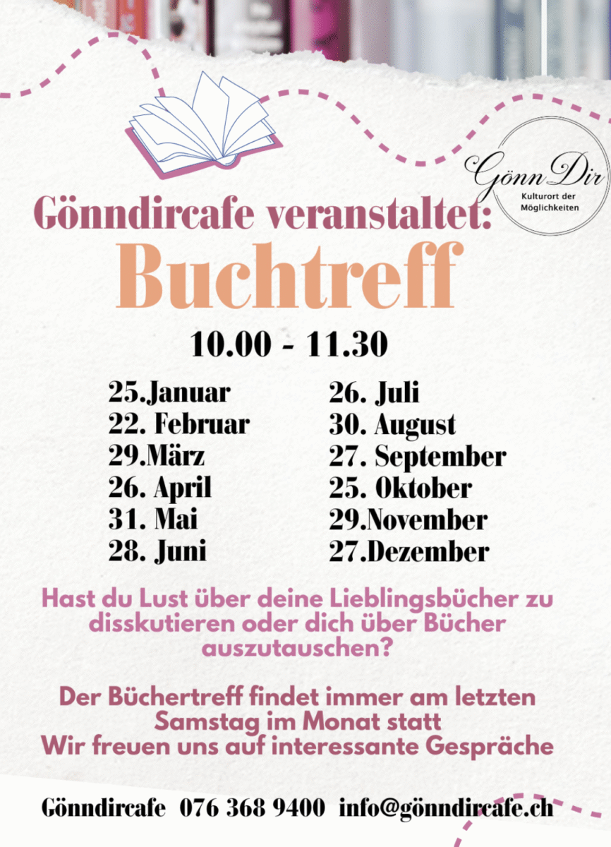 Wer hat Lust, über seine Lieblingsbücher zu diskutieren oder sich über Bücher auszutauschen? Wie immer am letzten Samstag im Monat findet der Buchtreff im Gönndircafé an der Signalstrasse 15 in Rorschach morgen Samstag, 30. August 2025, von 10.00 – 11.30 Uhr statt. Man kann andere Bücherfreundinnen und Bücherfreunde treffen und sich auf interessante Gespräche freuen.