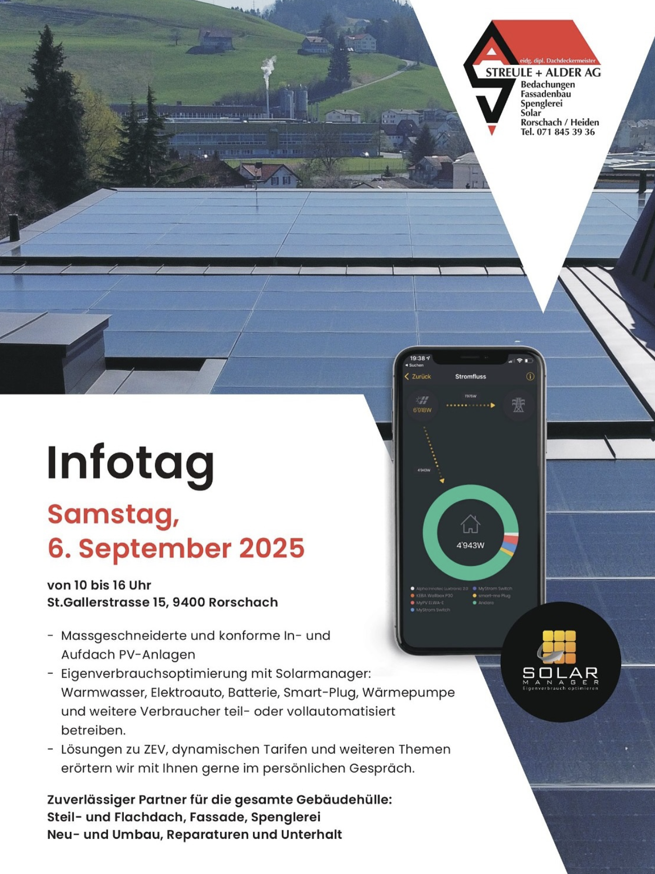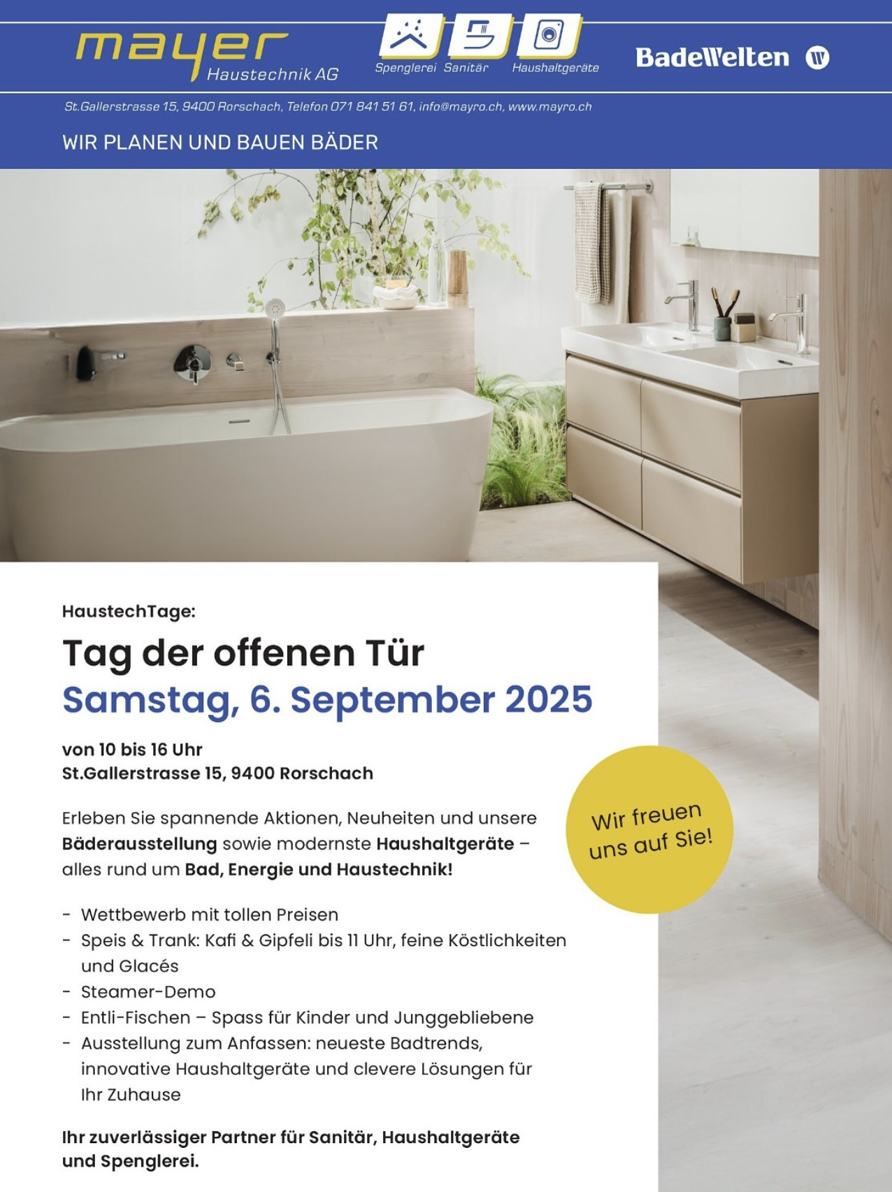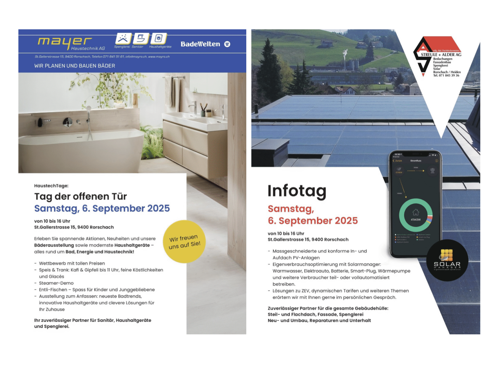Die Mayer Haustechnik AG am kommenden Samstag, 6. September 2025, zum Tag der offenen Tür und die Streule + Alder AG zum Infotag. Beide Angebote finden an der St.Gallerstrasse 15 in Rorschach statt. Mehr Infos findet man auf den Flyern unten.