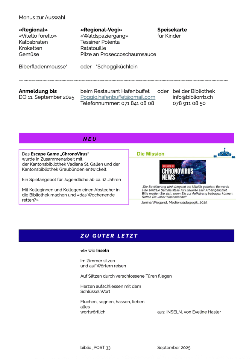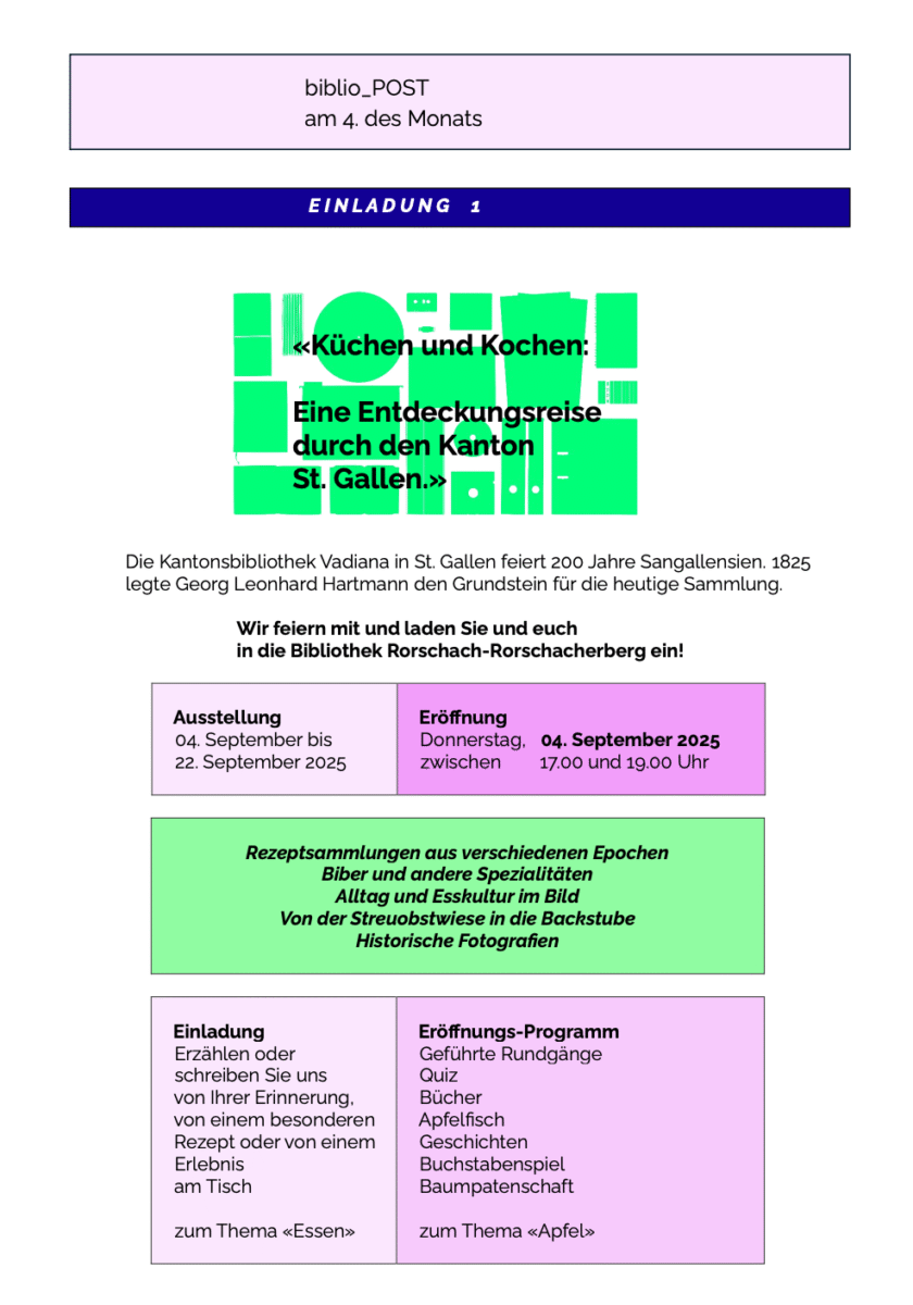 Die monatlichen News aus unserer BibliothekThemen:KulturRorschach 4. September 2025 - 05:10Wie immer am 4. jeden Monats, kreiert von Imelda Natter. Mehr zur Bibliothek finden Interessierte hier. Teilen mit: Einen Link per E-Mail an einen Freund senden (Wird in neuem Fenster geöffnet) E-Mail Drucken (Wird in neuem Fenster geöffnet) Drucken Auf Facebook teilen (Wird in neuem Fenster geöffnet) Facebook Auf X teilen (Wird in neuem Fenster geöffnet) X Auf WhatsApp teilen (Wird in neuem Fenster geöffnet) WhatsApp Gefällt mir:Gefällt mir Wird geladen …Newsletter abonnieren Bitte dieses Feld leer lassenBitte wähle, ob Du über jeden neuen Beitrag sofort oder lieber jeden Morgen gegen 9 Uhr eine Zusammenfassung der neusten Beiträge erhalten möchtest.Liste(n) auswählen: Neues vom Echo (Zusammenfassung) Neues vom Echo (Sofortbenachrichtigung) Dieses Feld wird benötigt.Prüfen Sie Ihren Posteingang und den Spamordner, um Ihr Abonnement zu bestätigen.