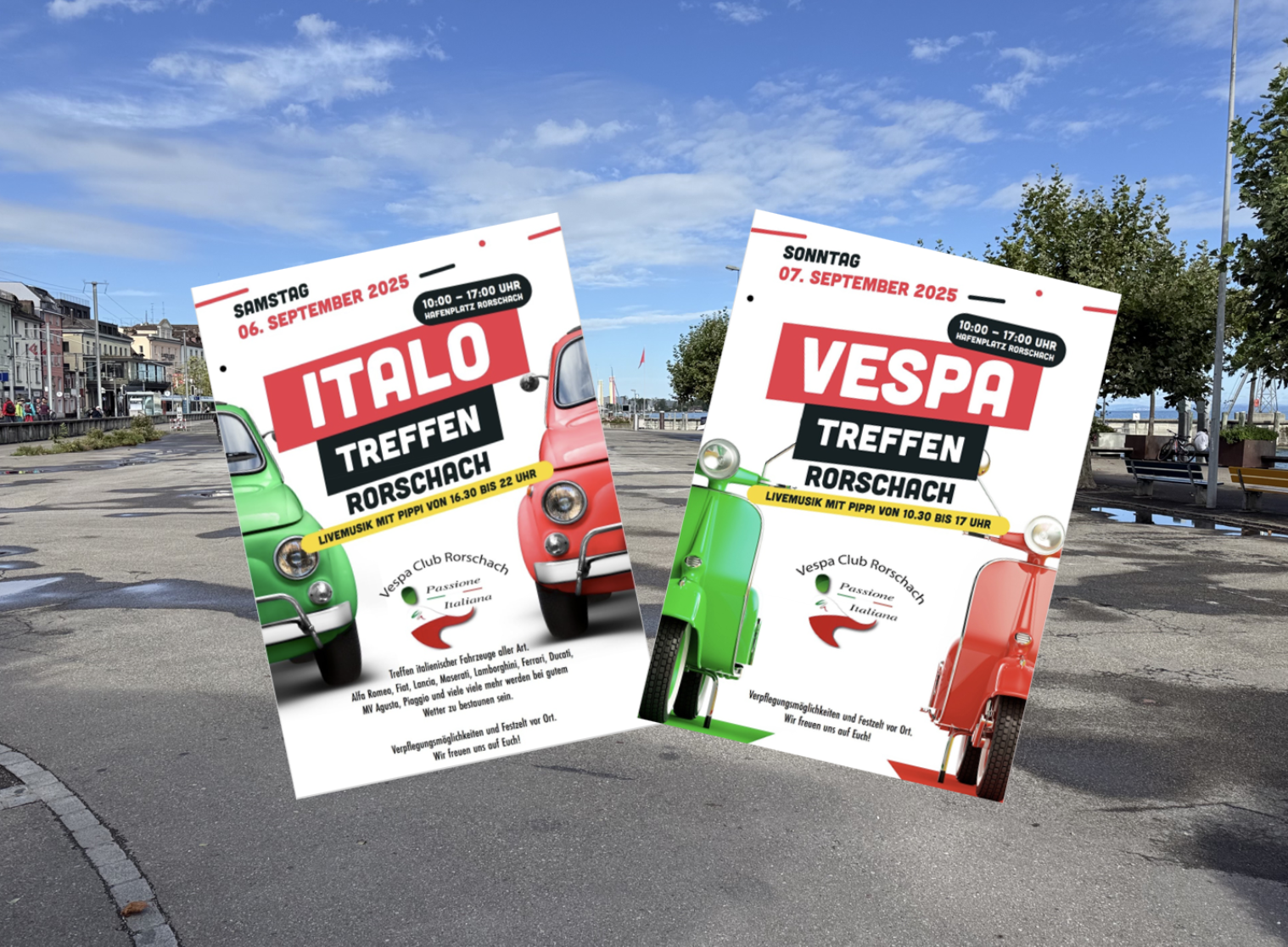 Der Hafenplatz wird heute und morgen ganz vom Vespaclub Rorschach in Beschlag genommen. Das Italo-Treffen (heute Samstag, 06. September 2025 / 10.00 – 22:00 Uhr ++ Livemusik mit Pippi ab 16.30 Uhr) und das traditionelle Vespa-Treffen (morgen Sonntag, 07. September 2025 / 10.00 – 17.00 Uhr ++ Livemusik mit Pippi ab 10.30 Uhr) werden weder zu übersehen noch zu überhören sein. Mehr Infos rund um den Vespaclub Rorschach findet man auch hier.