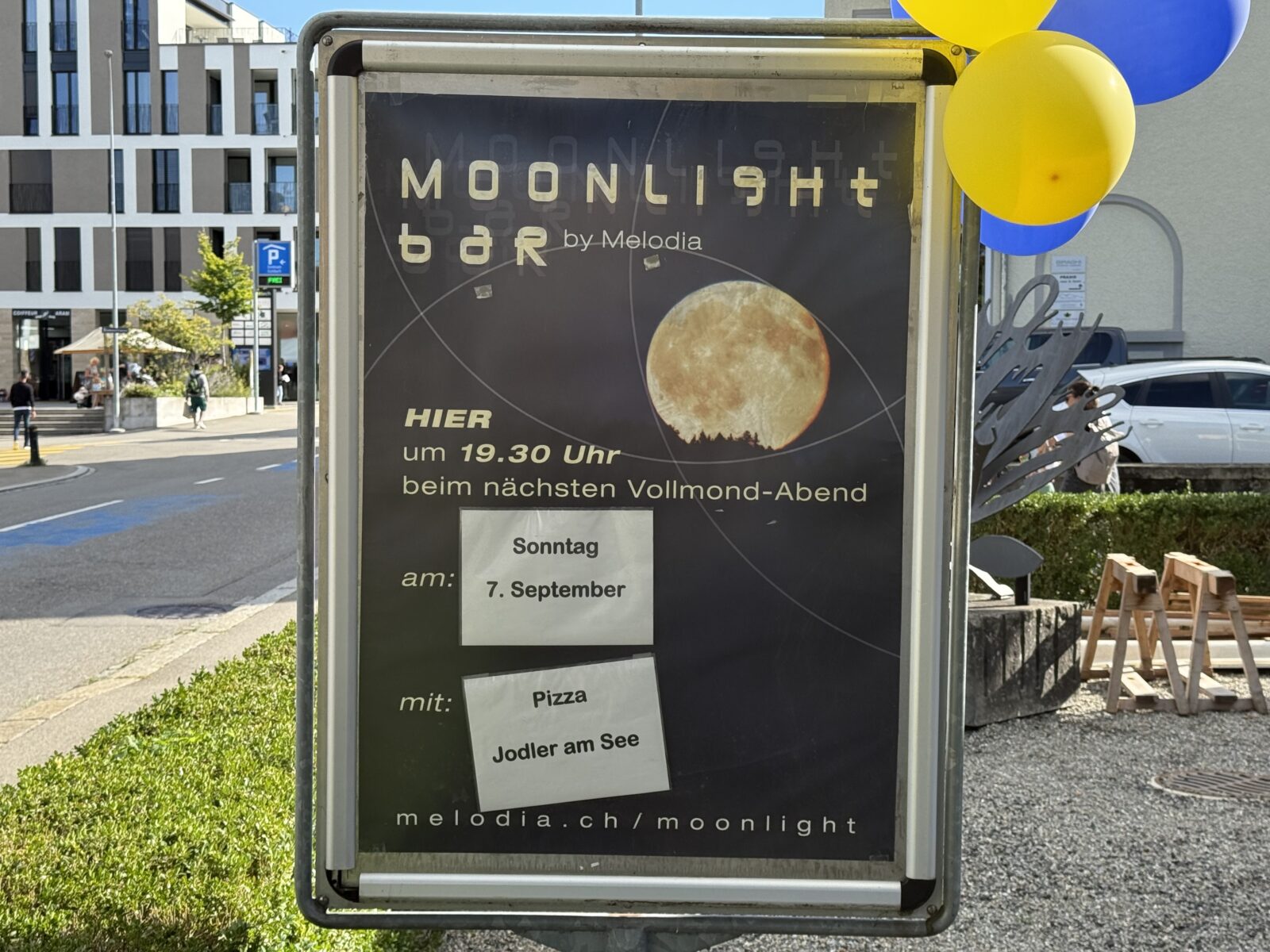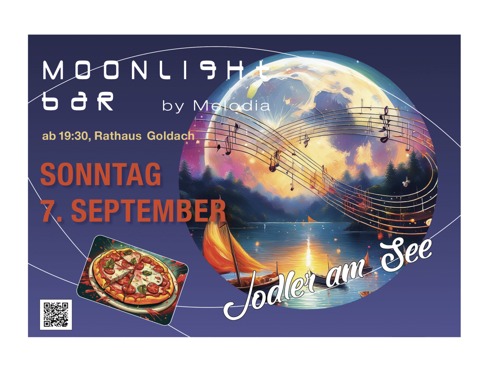Der Dorfbummel ist Geschichte, aber nicht die Moonlightbar. Die Melodia Goldach betreibt diese heute Sonntag ab 19.30 Uhr direkt beim Rathaus Goldach. Das Moonlightbar-Team schreibt dazu: „Wir bieten einen inspirierenden Abschluss von Ihrem Wochenende. Heute Sonntag, 7. September 2025 scheint der Vollmond auf den Platz vor dem Rathaus in Goldach, und er freut sich über das ihm gebotene Bild. Er sieht viele Personen, die gemütlich miteinander plaudern, ein gelbes Zelt und farbige Lichter, und dort eine spezielle Gruppe, in einem Halbkreis formiert, mit hübscher Kleidung. Was geschieht hier? Der Vollmond hört Stimmen, die zu einem harmonischen Gesang verschmelzen, mal traditionell, mal modern, ein schweizerisches Brauchtum. Das gefällt ihm sehr. Und schliesslich ist da noch dieser Duft, mmmh, es riecht von diesem heissen, belegten Teigböden… Unsere musikalischen Gäste sind die Jodler am See.“