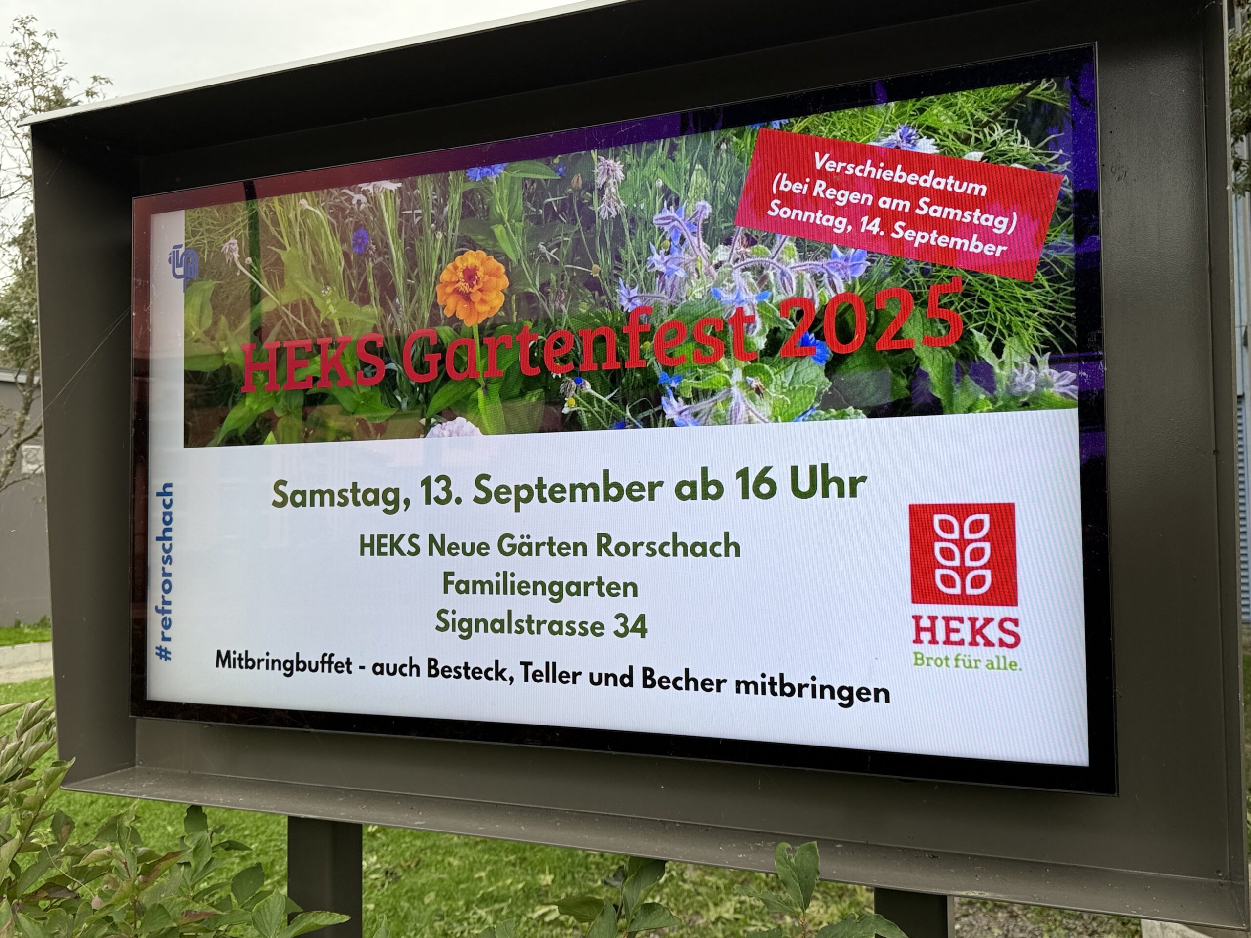 Heute ab 16 Uhr Gartenfest an der SignalstrasseThemen:KulturPartnerRef. RorschachRorschach 13. September 2025 - 11:59Wenn das Wetter nicht mitmachen sollte findet das Ganze morgen Sonntag statt.Teilen mit: Einen Link per E-Mail an einen Freund senden (Wird in neuem Fenster geöffnet) E-Mail Drucken (Wird in neuem Fenster geöffnet) Drucken Auf Facebook teilen (Wird in neuem Fenster geöffnet) Facebook Auf X teilen (Wird in neuem Fenster geöffnet) X Auf WhatsApp teilen (Wird in neuem Fenster geöffnet) WhatsApp Gefällt mir:Gefällt mir Wird geladen …Newsletter abonnieren Bitte dieses Feld leer lassenBitte wähle, ob Du über jeden neuen Beitrag sofort oder lieber jeden Morgen gegen 9 Uhr eine Zusammenfassung der neusten Beiträge erhalten möchtest.Liste(n) auswählen: Neues vom Echo (Zusammenfassung) Neues vom Echo (Sofortbenachrichtigung) Dieses Feld wird benötigt.Prüfen Sie Ihren Posteingang und den Spamordner, um Ihr Abonnement zu bestätigen.