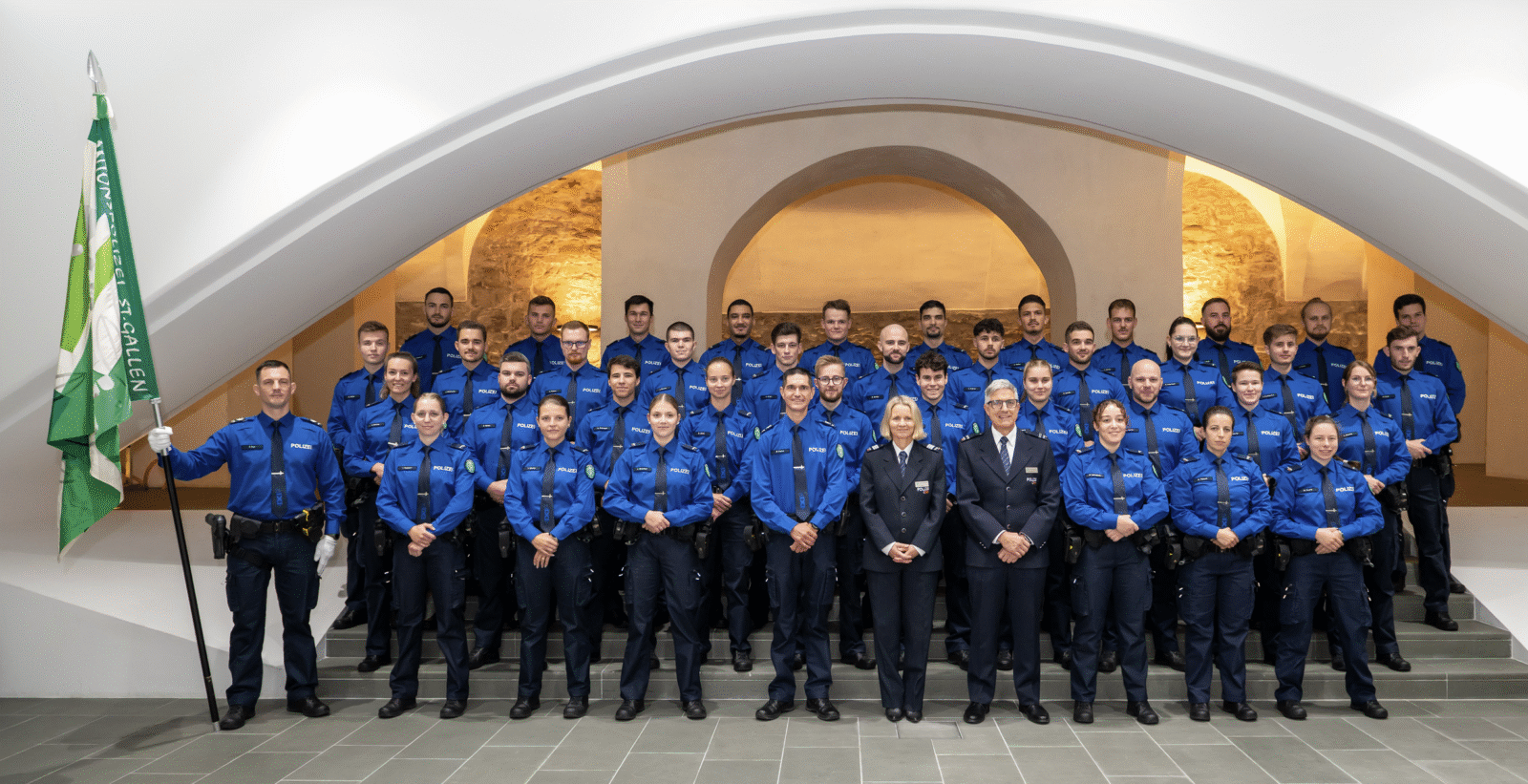 Bereits einen Teil der zweijährigen Ausbildung haben die Absolventinnen und Absolventen der Polizeischule 2024–2026 hinter sich. Sie haben vergangenen Herbst die zweijährige Ausbildung angetreten. Nun haben 12 Frauen und 26 Männer die Vorprüfungen der Polizeischule Ostschweiz bestanden und treten jetzt in ihr zweites praktisches Ausbildungsjahr über. Sie feierten ihre Inpflichtnahme ebenfalls am Donnerstag. Sie werden nun bei der Kantonspolizei St.Gallen unter anderem von professionellen Mentoren und Praxisbegleitenden im polizeilichen Alltag eingeführt und weitergebildet. So erhalten sie das praktische Rüstzeug, um am Ende ihrer zweiten Ausbildungsphase die Berufsprüfung zur Polizistin oder zum Polizisten mit eidgenössischem Fachausweis ablegen zu können.