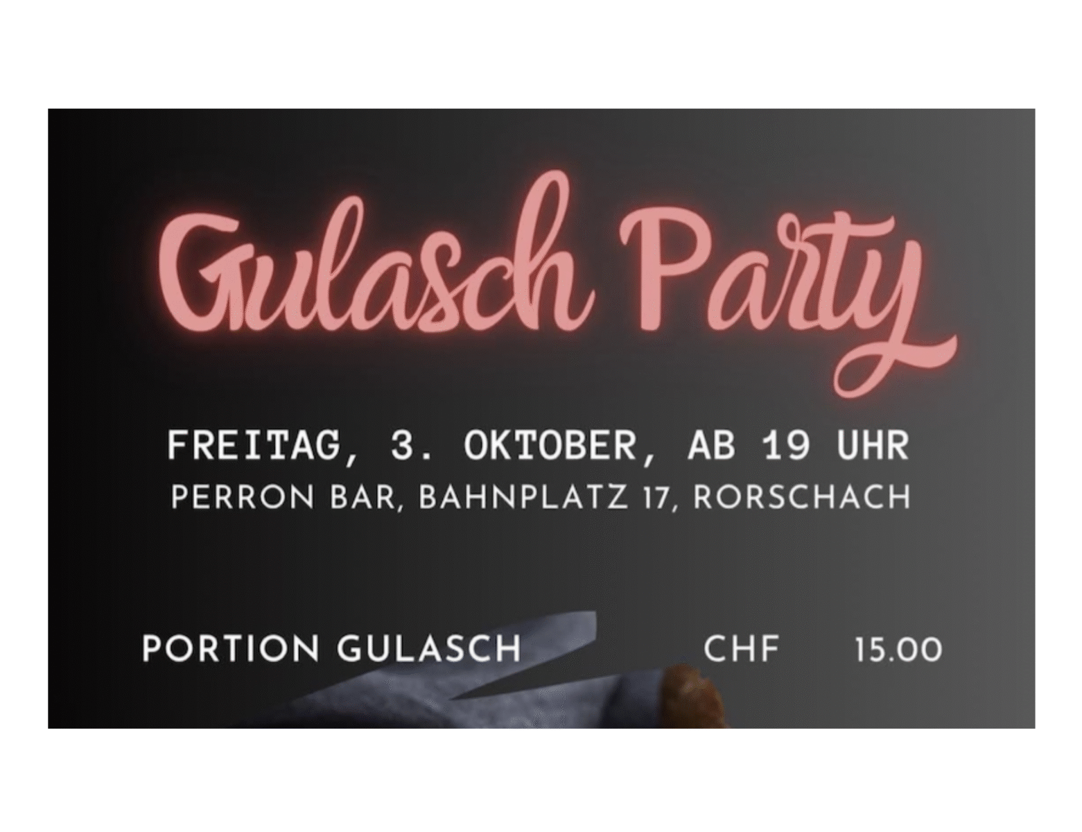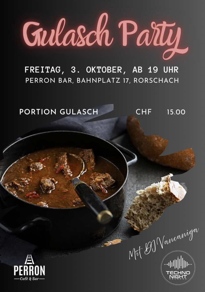 Die Perron-Bar findet man direkt beim Hafenbahnhof Rorschach. Die Gulasch-Party startet um 19 Uhr und eine Portion kostet 15 Stutz. (Flyer: pd)