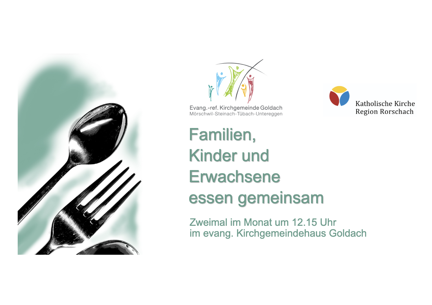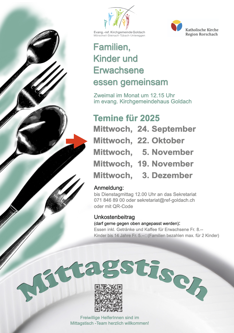 Der nächste ökumenische Mittagstisch findet kommenden Mittwoch, 22. Oktober um 12.15 Uhr im evangelischen Kirchgemeindehaus in Goldach statt. Anmeldungen bis Dienstag, 21. Oktober 2025, 12.00 Uhr an das Sekretariat der Evang.-ref. Kirchgemeinde, Goldach, Tel. 071 846 89 00 oder sekretariat@ref-goldach.ch. Ein Unkostenbeitrag für Essen und Getränke von CHF 8.00 pro Erwachsener und CHF 5.00 pro Kind gilt als Richtwert.