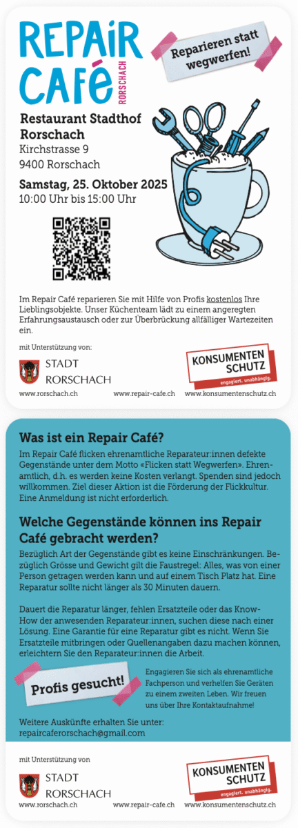 Kommenden Samstag, 25. Oktober 2025, findet von 10 bis 15 Uhr das erste Repair Café Rorschach im Restaurant Stadthof an der Kirchstrasse 9 statt. Im Repair Café flicken ehrenamtliche ReparateurInnen defekte Gegenstände unter dem Motto „Flicken statt Wegwerfen“. Ehrenamtlich, d.h. es werden keine Kosten verlangt. Spenden sind jedoch willkommen. Ziel dieser Aktion ist die Förderung der Flickkultur. Eine Mitarbeit der KundInnen beim Flicken (Learning by doing) ist erwünscht. Eine Anmeldung ist nicht erforderlich.