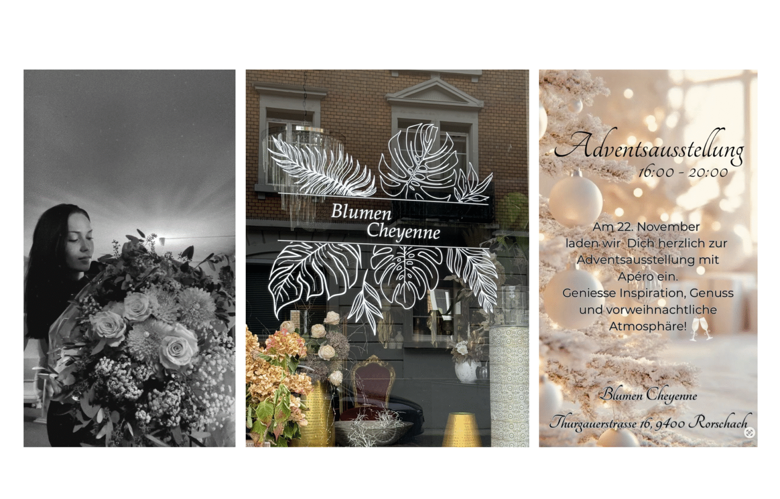 Blumen Cheyenne lädt zur AdventsausstellungThemen:Blumen CheyennePartnerRorschach 23. Oktober 2025 - 05:30Blumen Cheyenne findet man an der Thurgauerstrasse 16 in Rorschach. Mehr zu diesem Blumengeschäft findet man hier und hier. Die Adventsausstellung findet am Samstag, 22. November 2025, statt.Teilen mit: Klicken, um einem Freund einen Link per E-Mail zu senden (Wird in neuem Fenster geöffnet) E-Mail Klicken zum Ausdrucken (Wird in neuem Fenster geöffnet) Drucken Klick, um auf Facebook zu teilen (Wird in neuem Fenster geöffnet) Facebook Klicke, um auf X zu teilen (Wird in neuem Fenster geöffnet) X Klicken, um auf WhatsApp zu teilen (Wird in neuem Fenster geöffnet) WhatsApp Gefällt mir:Gefällt mir Wird geladen …Newsletter abonnieren Bitte dieses Feld leer lassenBitte wähle, ob Du über jeden neuen Beitrag sofort oder lieber jeden Morgen gegen 9 Uhr eine Zusammenfassung der neusten Beiträge erhalten möchtest.Liste(n) auswählen: Neues vom Echo (Zusammenfassung) Neues vom Echo (Sofortbenachrichtigung) Dieses Feld wird benötigt.Prüfen Sie Ihren Posteingang und den Spamordner, um Ihr Abonnement zu bestätigen.