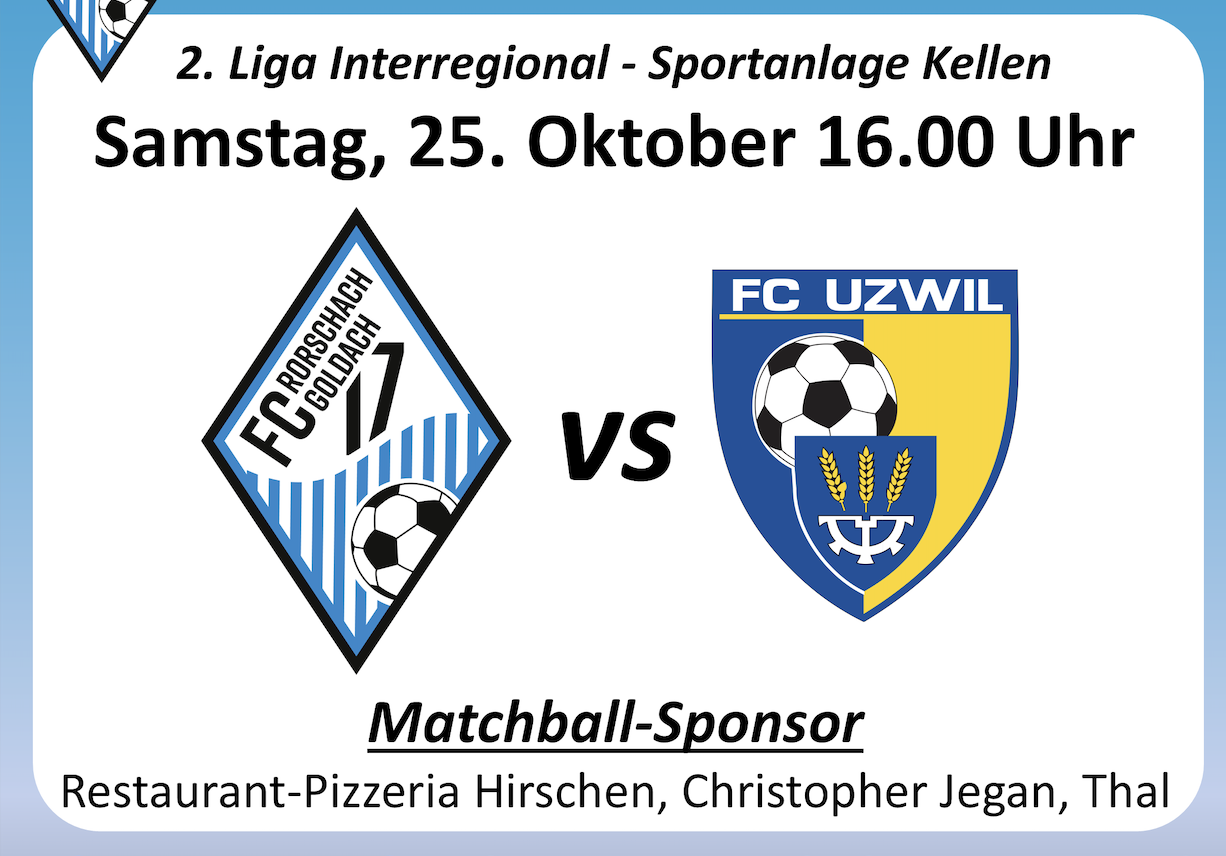 Hier die Matchvorschau von Pfütz Keel zum Meisterschaftsspiel der 2. Liga Interregional zwischen dem FC Rorschach-Goldach 17 und dem FC Uzwil, welches kommenden Samstag, 25. Oktober 2025, ab 16 h auf der Sportanlage Kellen in Tübach ausgetragen wird.