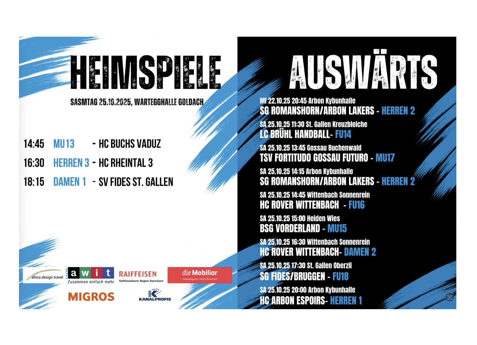 Die Herbstferien sind vorbei. Es wird wieder Handball gespielt. Das Damen 1 spielt heute um 18:15 Uhr in der Wartegghalle Goldach gegen die SV Fides St. Gallen und das Herren 1 hat ebenfalls heute um 20 Uhr auswärts beim HC Arbon Espoirs anzutreten. Die Resultate werden nachgereicht.