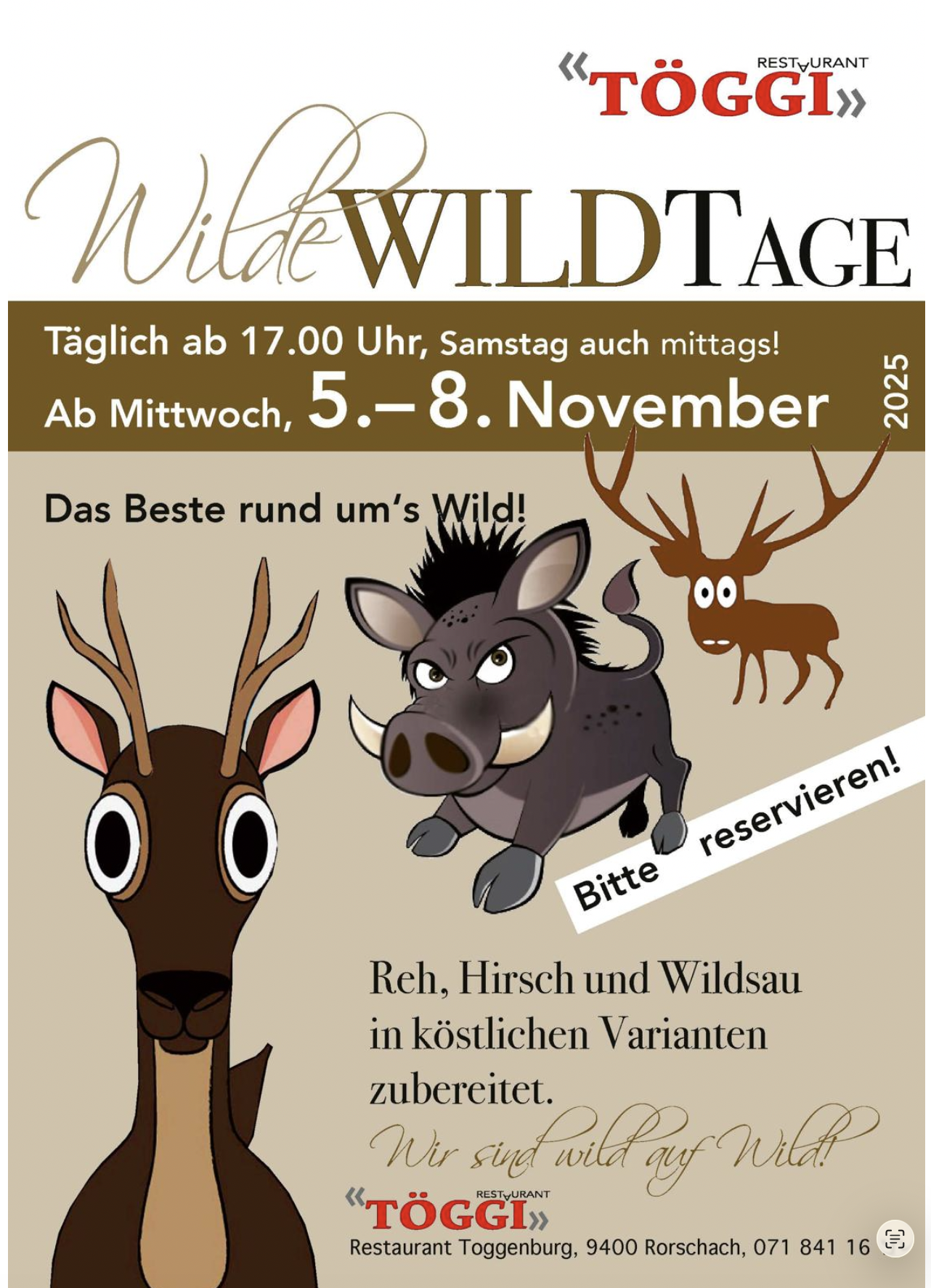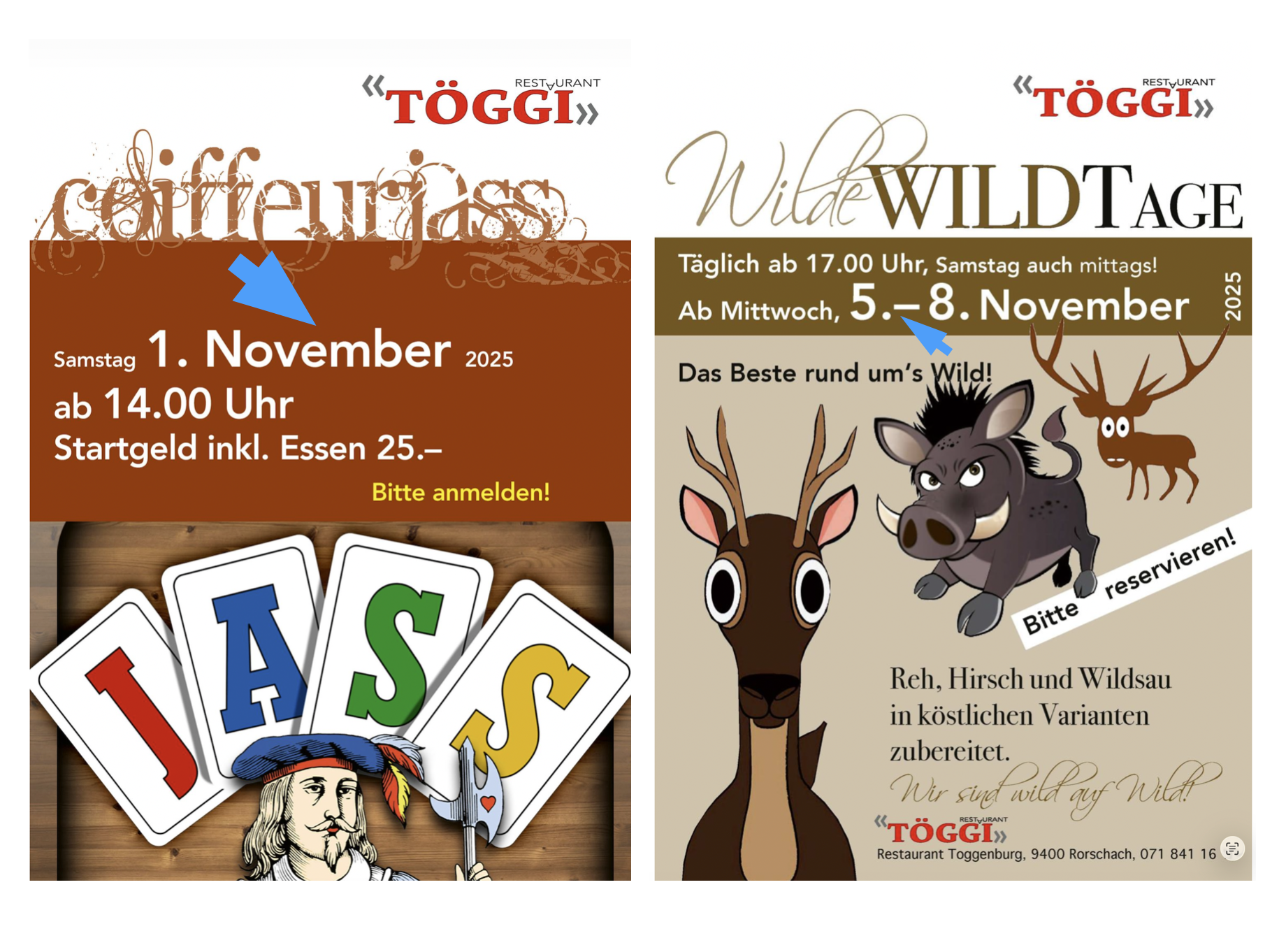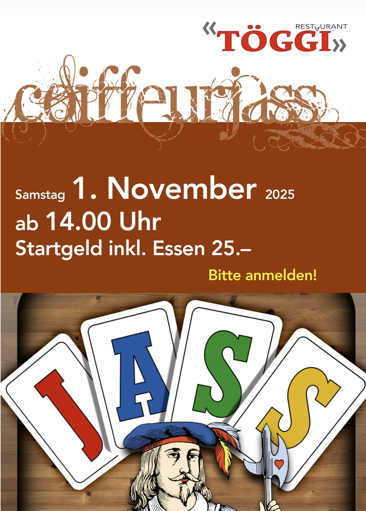 Ob es allerdings noch Platz beim Coiffeurjass hat muss man nachfragen: Tel: 071 841 16 10 oder 079 270 78 54. Und wer nächste Woche wild auf Wild ist weiss, dass man reservieren muss. Sonst läuft da nämlich gar nichts…