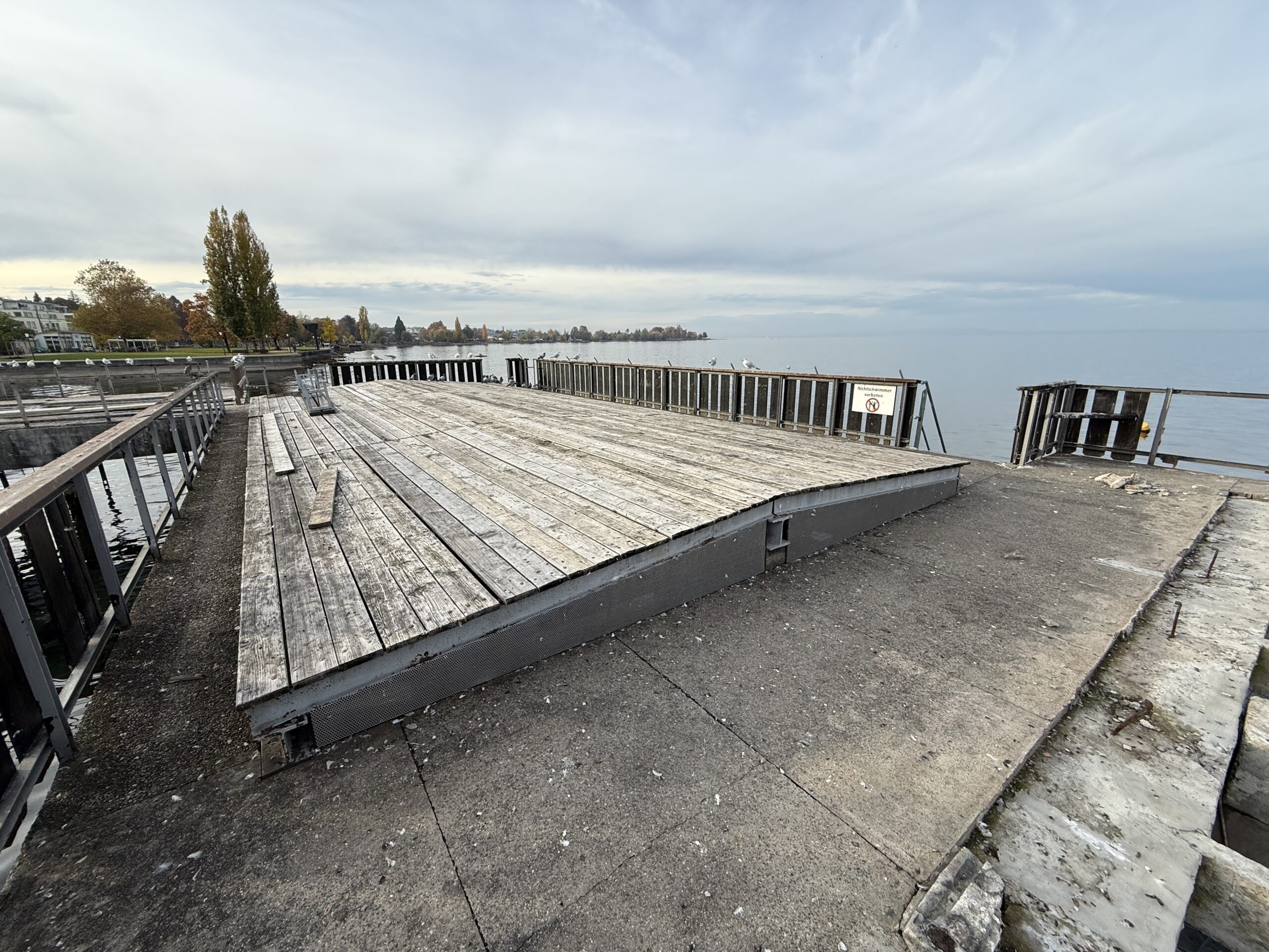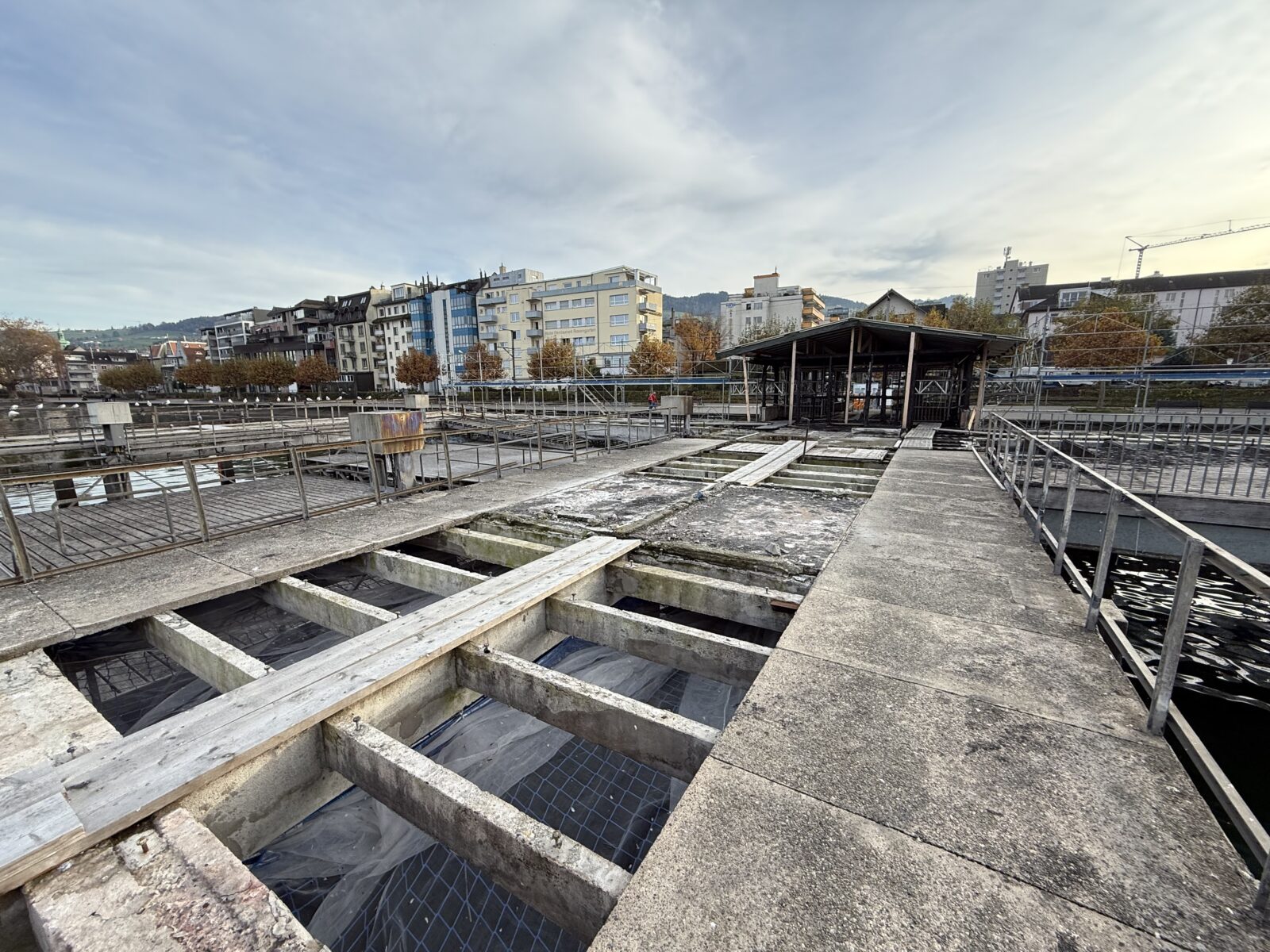 Rowena Schmocker hat auch bekannt gegeben, dass zwischen dem 11. und 14. November 2025 nochmals Sondierungsarbeiten stattfinden werden. Auch ein Taucher wird sich um die Pfahlfundamente kümmern. Und so by the way freute sie sich darüber, dass in der Ruine Fledermäuse eingezogen sind. Sie hatte auch eine Vielzahl von Fragen gestellt bekommen, die sie so gut wie möglich zu beantworten versuchte. Gehen wir mal davon aus, dass am nächsten Stadtapéro da in manchen Belangen etwas mehr Klarheit bestehen wird. Und zum Schluss hat das Rorschacher Echo noch die Erlaubnis erhalten, zusammen mit ihr die Badhütte zu betreten. So sieht unser ehemaliges Juwel innen aus: