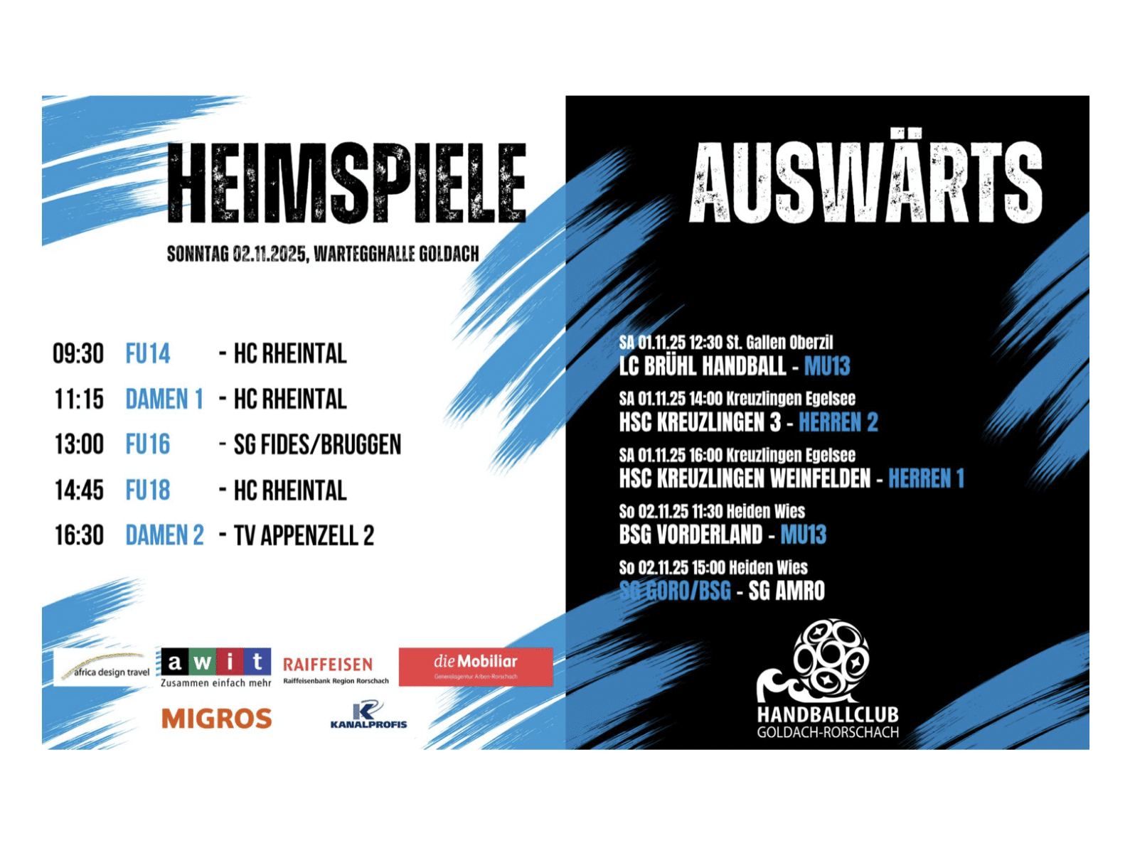 So spielen am Wochenende die HC GoRo-TeamsThemen:HC GoRo 1. November 2025 - 04:5510 Teams stehen im Einsatz. Am Sonntag sind 5 davon in der Wartegghalle Goldach im Einsatz, darunter das Damen 1. Die Resultate werden nachgereicht.Teilen mit: Klicken, um einem Freund einen Link per E-Mail zu senden (Wird in neuem Fenster geöffnet) E-Mail Klicken zum Ausdrucken (Wird in neuem Fenster geöffnet) Drucken Klick, um auf Facebook zu teilen (Wird in neuem Fenster geöffnet) Facebook Klicke, um auf X zu teilen (Wird in neuem Fenster geöffnet) X Klicken, um auf WhatsApp zu teilen (Wird in neuem Fenster geöffnet) WhatsApp Gefällt mir:Gefällt mir Wird geladen …Newsletter abonnieren Bitte dieses Feld leer lassenBitte wähle, ob Du über jeden neuen Beitrag sofort oder lieber jeden Morgen gegen 9 Uhr eine Zusammenfassung der neusten Beiträge erhalten möchtest.Liste(n) auswählen: Neues vom Echo (Zusammenfassung) Neues vom Echo (Sofortbenachrichtigung) Dieses Feld wird benötigt.Prüfen Sie Ihren Posteingang und den Spamordner, um Ihr Abonnement zu bestätigen.