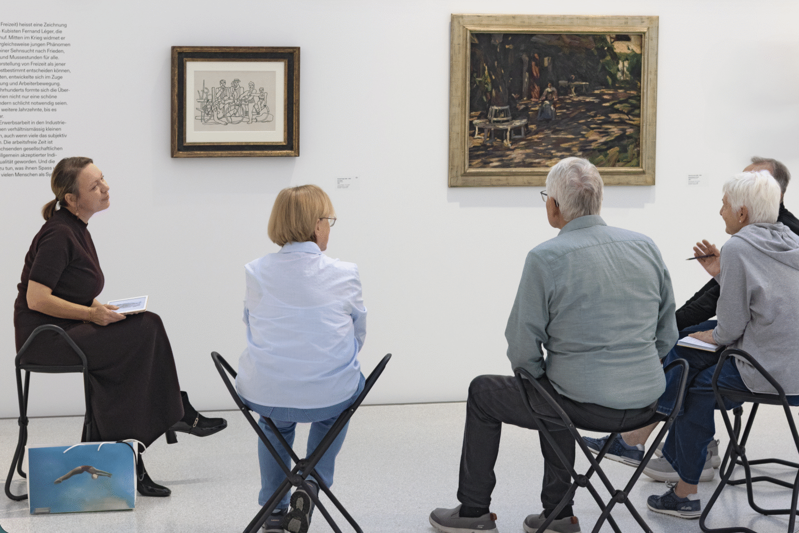 Neben kunsthistorischen Informationen steht dabei die persönliche Begegnung mit dem Werk im Mittelpunkt. Fragen, Eindrücke und Gespräche sind erwünscht. Die Teilnehmenden werden eingeladen, ihre Wahrnehmungen zu teilen und unterschiedliche Sichtweisen zu entdecken. Zum Auftakt stand die Tuschezeichnung «Les Loisirs» (Die Freizeit) des französischen Avantgarde-Künstlers Fernand Léger (1881–1955) im Mittelpunkt – ein Werk, das die Freizeitkultur der Moderne und den optimistischen Geist der Nachkriegszeit thematisiert. Beim gemeinsamen Betrachten entwickelten sich lebendige Diskussionen über die Bildsprache des Künstlers, kunsthistorische Zusammenhänge und die Bedeutung von Freizeit damals wie heute. Die Gäste zeigten sich begeistert von der dialogischen Form der Kunstbetrachtung und den neuen Perspektiven, die sich durch den intensiven Austausch eröffneten.