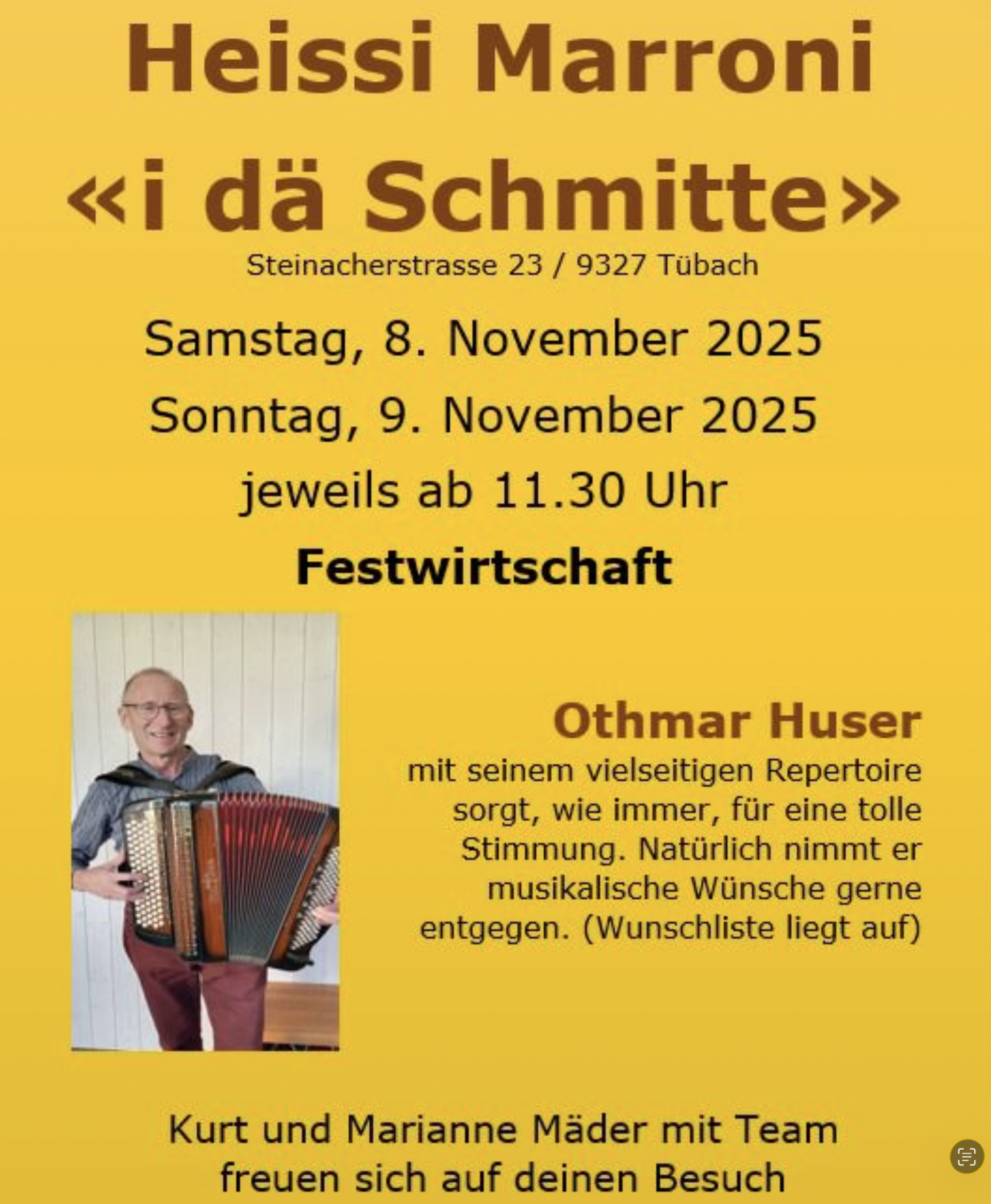 Das passiert am kommenden Wochenende jeweils ab 11.30 Uhr an der Steinacherstrasse 7 in Tübach. Details findet man auf dem Flyer unten.