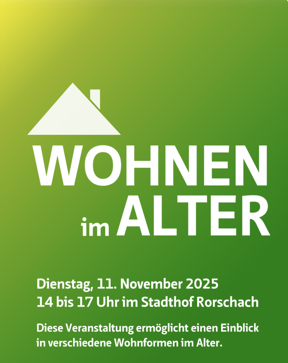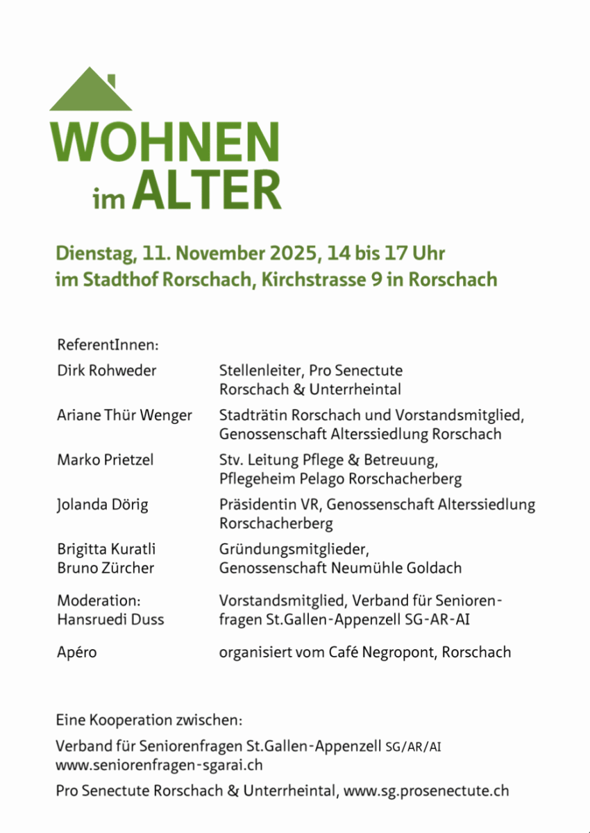 Der Verband für Seniorenfragen SG/AR/AI und Pro Senectute Rorschach & Unterrheintal laden gemeinsam zur öffentlichen Veranstaltung „Wohnen im Alter“ ein. Diese findet kommenden Dienstag, 11. November 2025, von 14 bis ca. 17 Uhr im Stadthof Rorschach an der Kirchstrasse 9 statt.