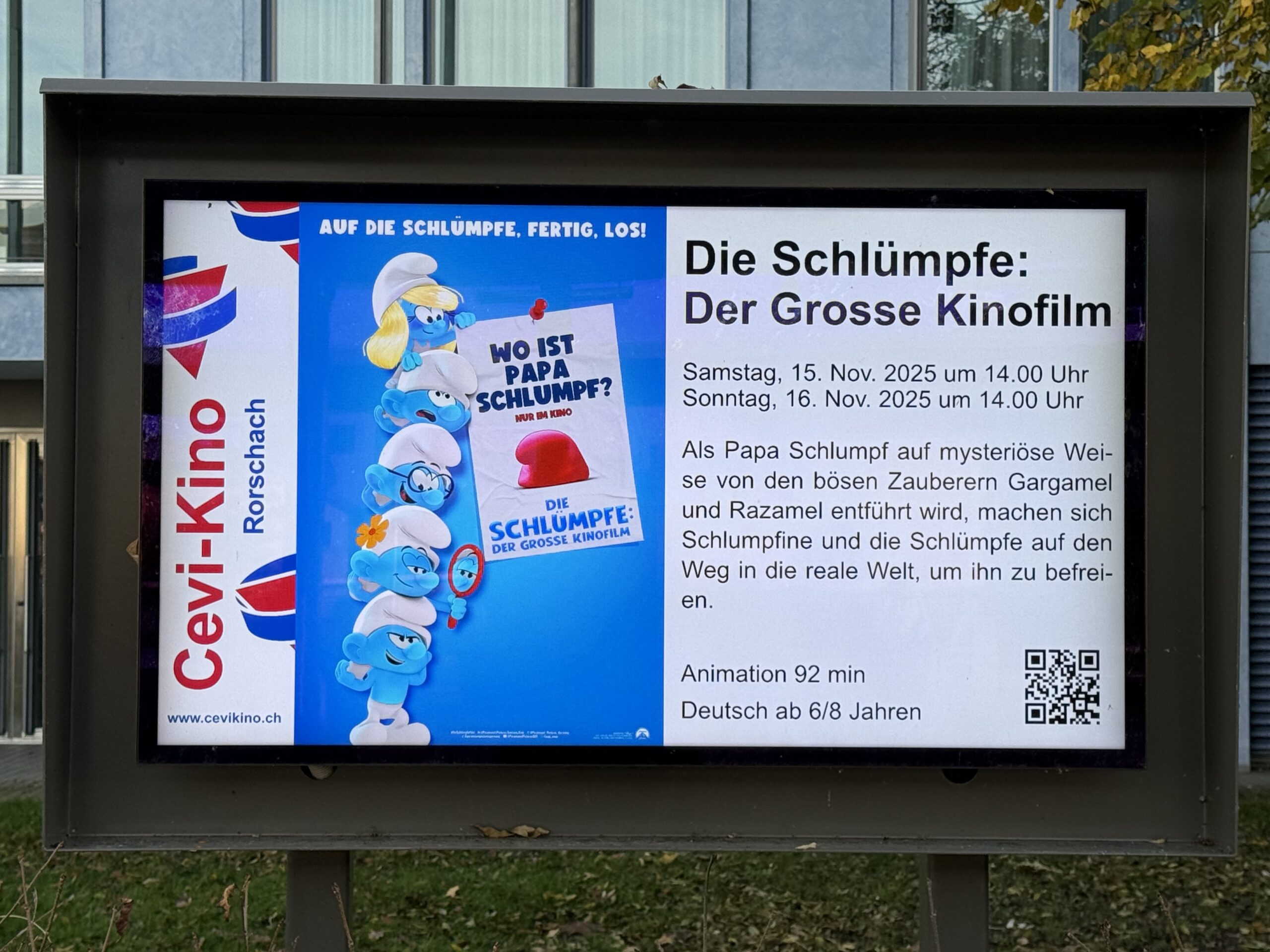 Heute Samstag gibt es 3 Filme im Cevi-Kino RorschachThemen:KulturPartnerRef. RorschachRorschach 15. November 2025 - 05:3014:00 Uhr: „Die Schlümpfe – der grosse Kinofilm“17:00 Uhr: „Die Schule der magischen Tiere 4“20:00 Uhr: „Stiller“Teilen mit: Klicken, um einem Freund einen Link per E-Mail zu senden (Wird in neuem Fenster geöffnet) E-Mail Klicken zum Ausdrucken (Wird in neuem Fenster geöffnet) Drucken Klick, um auf Facebook zu teilen (Wird in neuem Fenster geöffnet) Facebook Klicke, um auf X zu teilen (Wird in neuem Fenster geöffnet) X Klicken, um auf WhatsApp zu teilen (Wird in neuem Fenster geöffnet) WhatsApp Gefällt mir:Gefällt mir Wird geladen …Newsletter abonnieren Bitte dieses Feld leer lassenBitte wähle, ob Du über jeden neuen Beitrag sofort oder lieber jeden Morgen gegen 9 Uhr eine Zusammenfassung der neusten Beiträge erhalten möchtest.Liste(n) auswählen: Neues vom Echo (Zusammenfassung) Neues vom Echo (Sofortbenachrichtigung) Dieses Feld wird benötigt.Prüfen Sie Ihren Posteingang und den Spamordner, um Ihr Abonnement zu bestätigen.