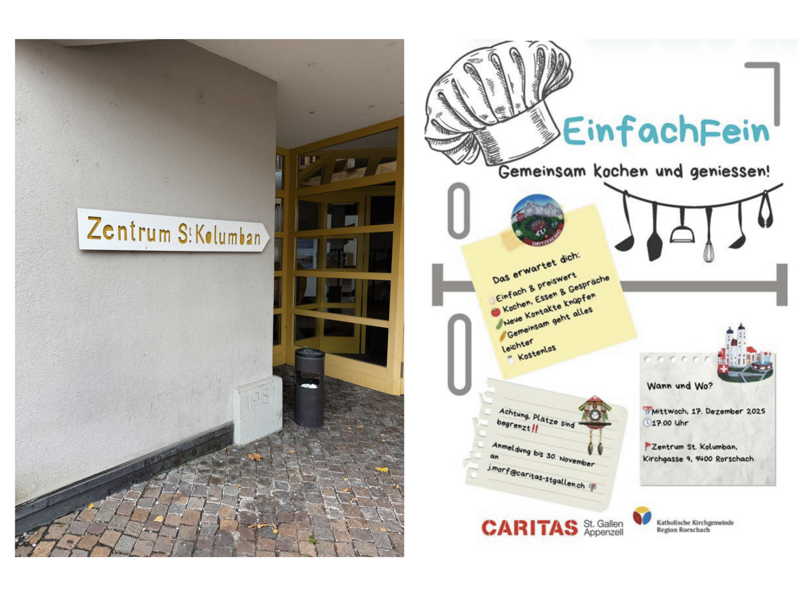 Jeniffer Morf ist Leiterin des kirchlichen Sozialdienstes der KKRR in Rorschach. Sie wird im Dezember einen Kochabend anbieten. „EinfachFein“ heisst dieses Angebot. Ziel ist: Gemeinsam macht’s einfach mehr Spass. Bei „EinfachFein“ treffen sich Menschen, die gerne kochen, essen und sich austauschen. Wir bereiten alles zusammen zu, geniessen das Essen und räumen anschliessend gemeinsam auf. Offen für alle, ob allein oder mit Familie. Der erste Anlass findet am 17. Dezember 2025 ab 17 Uhr im Zentrum St. Kolumban statt. Alle weiteren Details finden Interessierte auf dem Flyer unten.