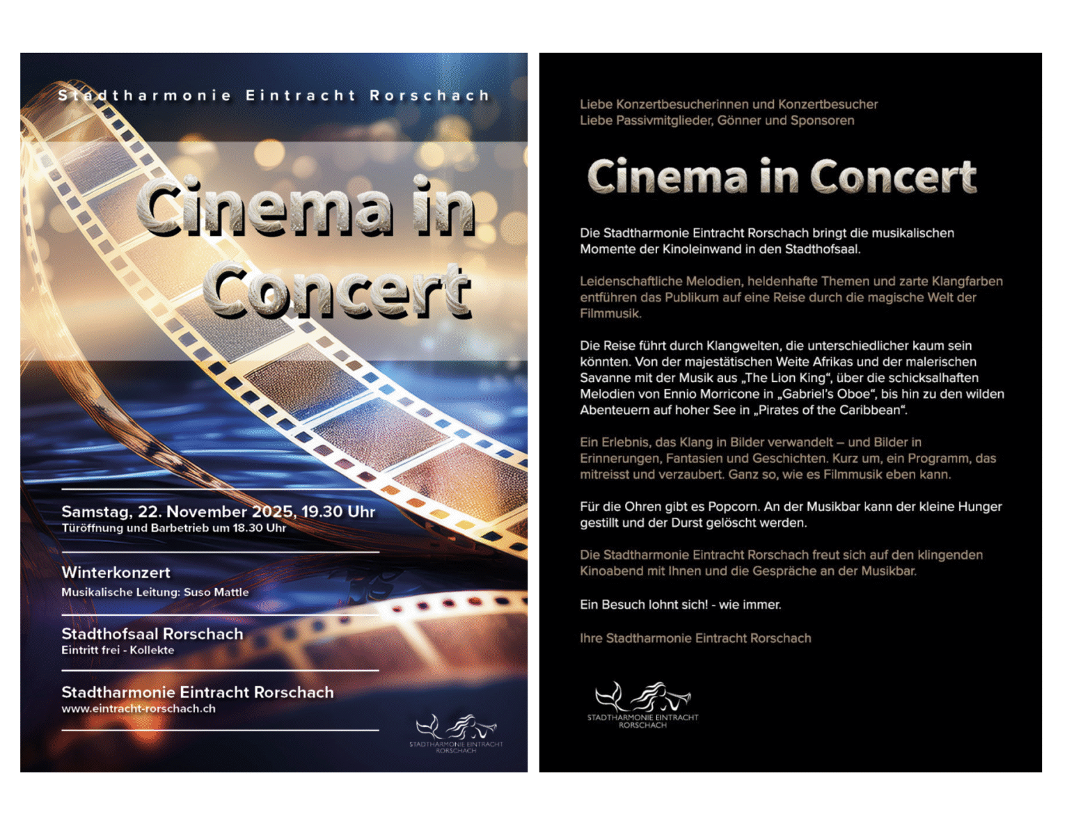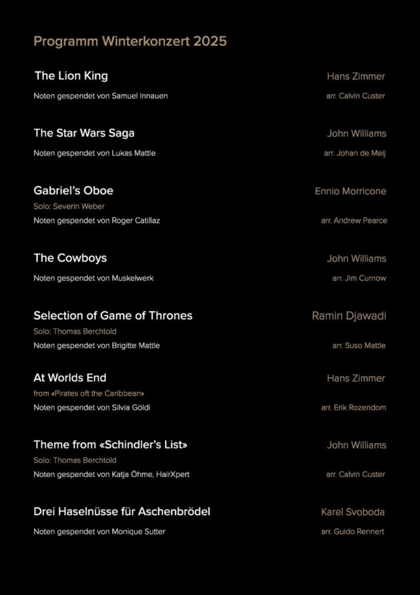 Winterkonzert der Stadtharmonie Eintracht RorschachThemen:EintrachtKulturRorschach 18. November 2025 - 05:30Kommenden Samstag im Stadthofsaal in Rorschach. Mehr zur Stadtharmonie Eintracht Rorschach finden Interessierte auch hier. Teilen mit: Klicken, um einem Freund einen Link per E-Mail zu senden (Wird in neuem Fenster geöffnet) E-Mail Klicken zum Ausdrucken (Wird in neuem Fenster geöffnet) Drucken Klick, um auf Facebook zu teilen (Wird in neuem Fenster geöffnet) Facebook Klicke, um auf X zu teilen (Wird in neuem Fenster geöffnet) X Klicken, um auf WhatsApp zu teilen (Wird in neuem Fenster geöffnet) WhatsApp Gefällt mir:Gefällt mir Wird geladen …Newsletter abonnieren Bitte dieses Feld leer lassenBitte wähle, ob Du über jeden neuen Beitrag sofort oder lieber jeden Morgen gegen 9 Uhr eine Zusammenfassung der neusten Beiträge erhalten möchtest.Liste(n) auswählen: Neues vom Echo (Zusammenfassung) Neues vom Echo (Sofortbenachrichtigung) Dieses Feld wird benötigt.Prüfen Sie Ihren Posteingang und den Spamordner, um Ihr Abonnement zu bestätigen.