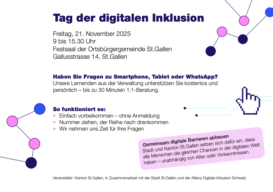 Der Kanton St.Gallen veranstaltet in Zusammenarbeit mit der Stadt St.Gallen und der Allianz digitale Inklusion Schweiz einen Beratungstag. Von 9 bis 15.30 Uhr beraten Lernende des Kantons im Festsaal der Ortsbürgergemeinde St.Gallen an der Gallusstrasse 14 die Bevölkerung im Umgang mit digitalen Anwendungen. Das Angebot ist gratis, eine Voranmeldung ist nicht notwendig. Wer eintrifft, kann eine Nummer ziehen und bis zu einer halben Stunde im persönlichen Gespräch beraten werden, sobald er oder sie an der Reihe ist.