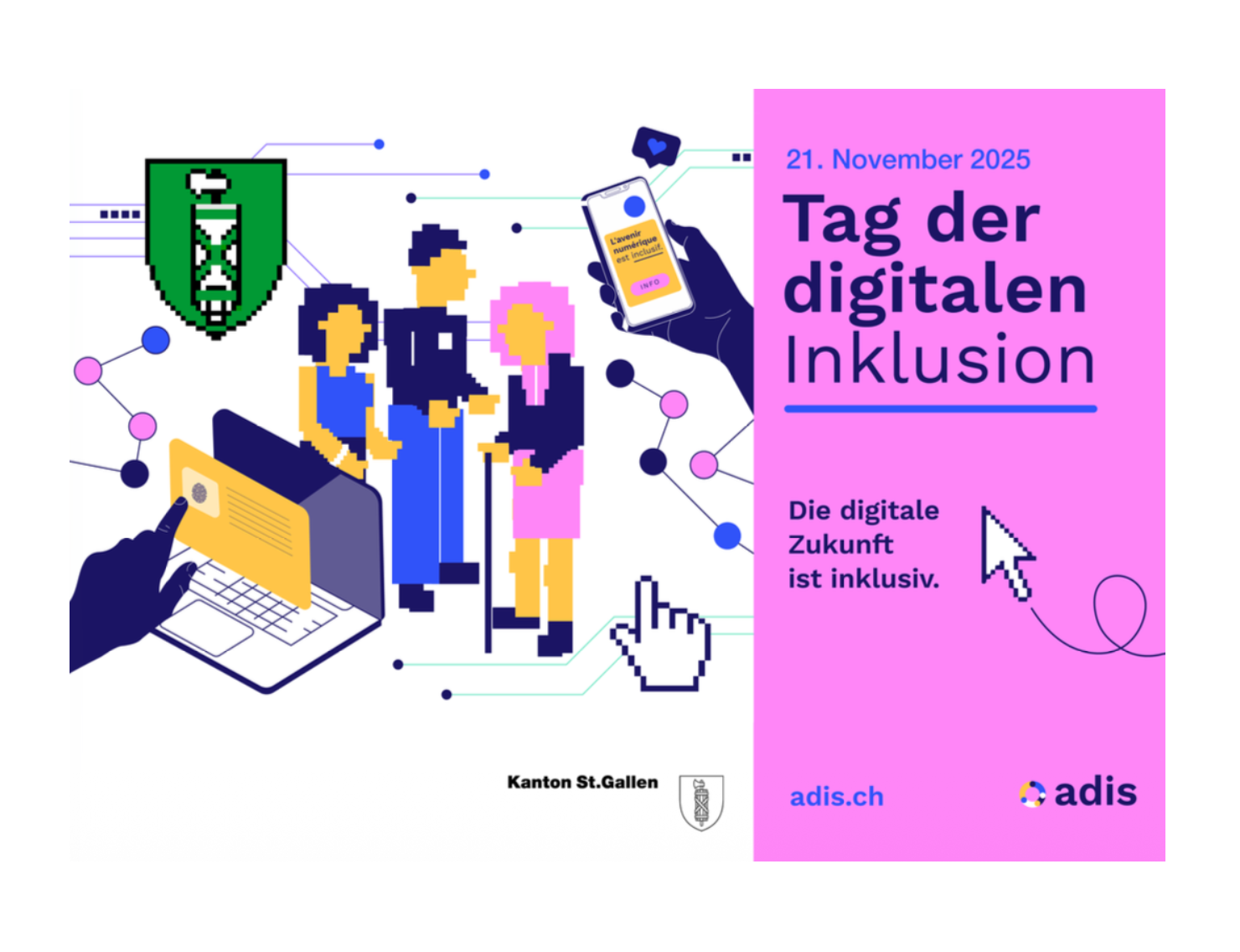 Der Kanton St.Gallen trat zudem als erster Kanton der vom Bund initiierten Allianz Digitale Inklusion Schweiz (ADIS) bei, die das Thema IT-Barrierefreiheit bei privaten und öffentlich-rechtlichen Akteurinnen und Akteuren bekannt machen und weiterentwickeln soll und auch den Tag der digitalen Inklusion organisiert.
