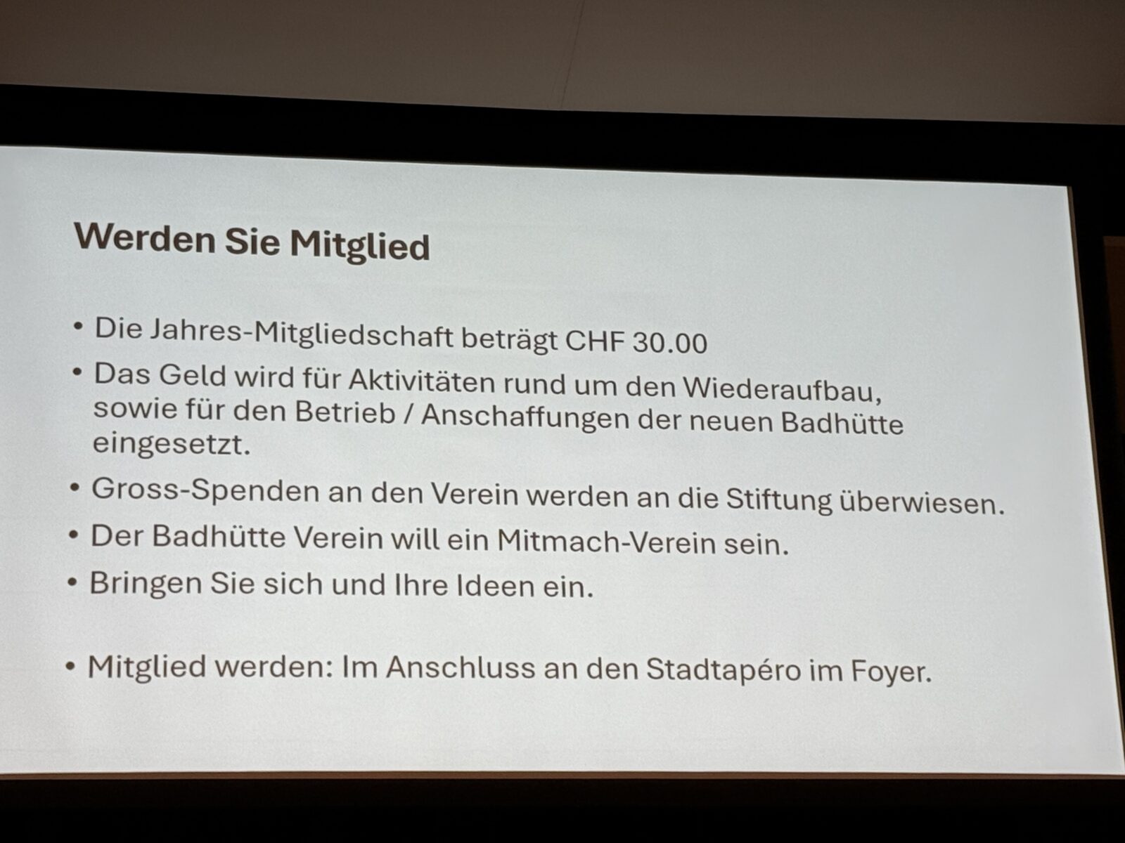 Richard Lehner hat am Dienstagabend beim Stadtapéro den am 11. November 2025 offiziell gegründeten Verein vorgestellt. Der Vorstand stellt sich wie folgt zusammen: Richard Lehner, Präsident; Kathrin Strey, Vizepräsidentin; Brigitte Hungerbühler, Aktuarin; Christian Baumann, Kassier; Noah Baumann, Web/Social Media; Monika Bürki, Programm/Events; Andreas Kern, Programm/Events; Anna Maria Frei Braun, Beisitzer; Lena Bürkler Widmer, Beisitzerin; Peter Spohn, Beisitzer; Jürg Keel, Beisitzer. Als Revisoren sind Hanspeter Trütsch und Alfred Zahner gewählt. Was der Verein will und wie man Mitglied werden kann sieht man auf den Folien unten.