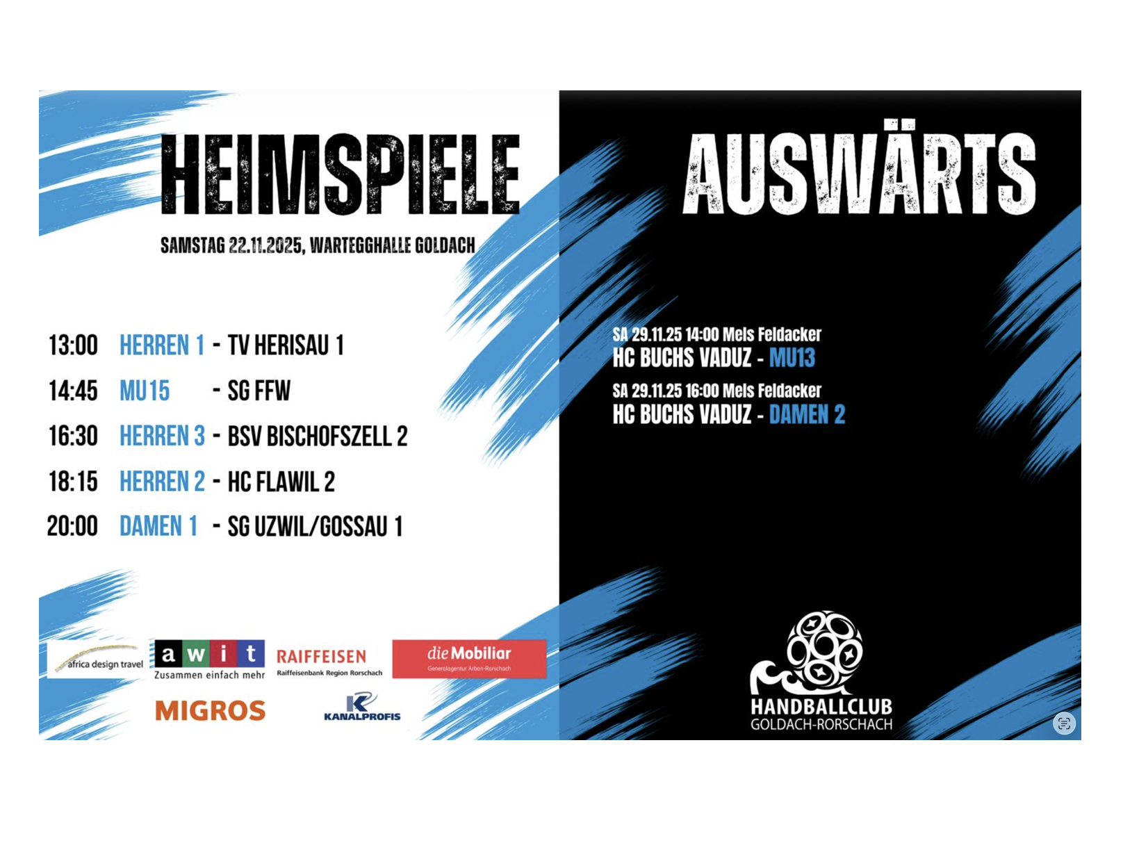 Volles Programm für den HC Goldach-Rorschach heute ab 13 Uhr in der Wartegghalle in Goldach. Den Start macht das Herren 1 gegen Herisau und den Abschluss ab 20 Uhr das Damen 1 gegen Uzwil/Gossau. Die Resultate werden nachgereicht.