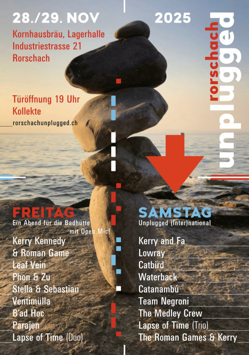 Rorschach Unplugged ging gestern vor viel wohlgesinntem Publikum und pointierten Formationen zum Thema Badhütte über die Bühne: Der Tenor: „Wir trauern nicht länger der abgebrannten Ikone nach, sondern freuen uns auf die Neue und halten Rorschach derweil kulturell auf hohem Level…! Heute Samstag messen sich die lokalen Rorschacher Acts mit Gruppen aus anderen Schweizer Städten. Schaut ab 19:00h vorbei, Eintritt gratis (Kollekte). Für Rorschach stehen Lowray, Waterback und die Gastgeber von Rorschach Unplugged, die Roman Games im Einsatz. Wir freuen uns auf Euren Besuch!“ Das Beitragsbild oben zeigt „Lapse of Time“ gestern Abend am Unplugged in der Kornhausbräu – Emotionen pur!! (Text/Bilder: rel)