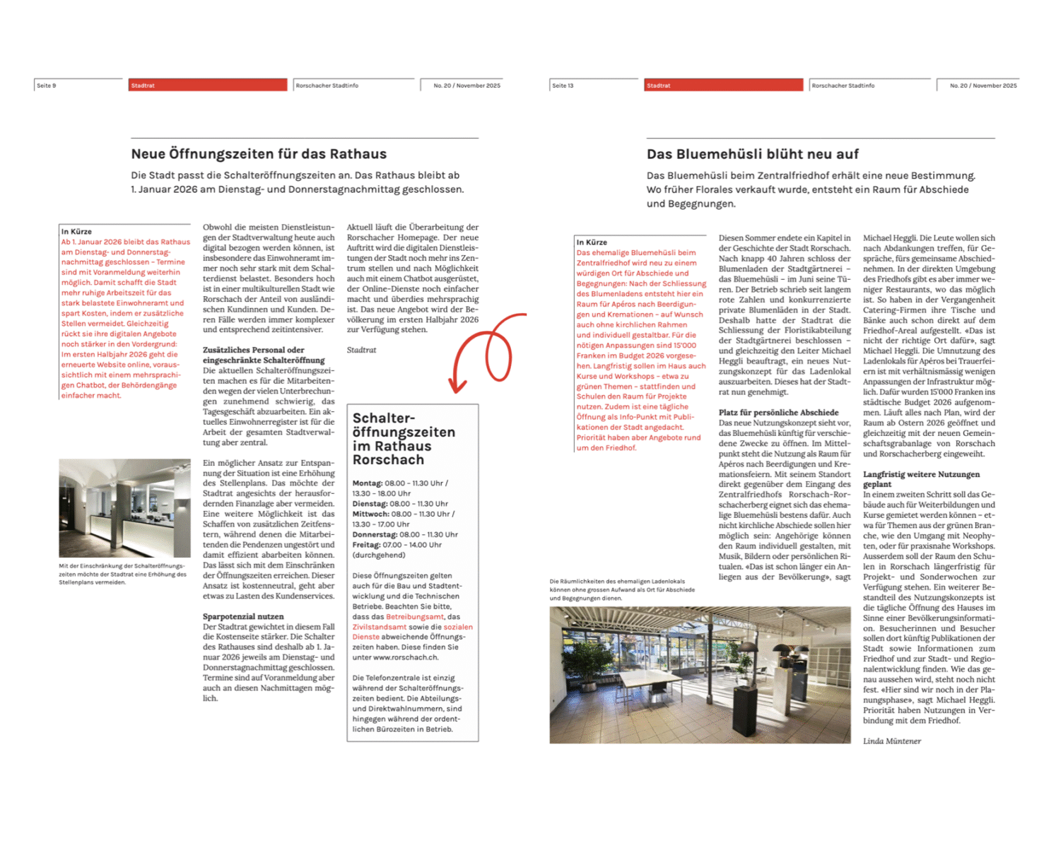 Zu finden ist der Bericht zu den neuen Öffnungszeiten für das Rathaus in den kürzlich verteilten Rorschacher Stadtinfos auf der Seite 9, jener zum „Das Bluemehüsli blüht neu auf“ auf Seite 13. Online sind die Berichte hier und hier zu finden.