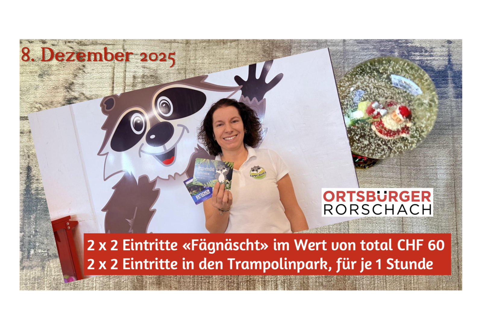 Die Ortsbürger Rorschach verschenken heute in ihrem Adventskalender gleich zwei Geschenksgutscheine à je 60 Franken für das Fägnäscht und den Trampolinpark. Viel Glück!