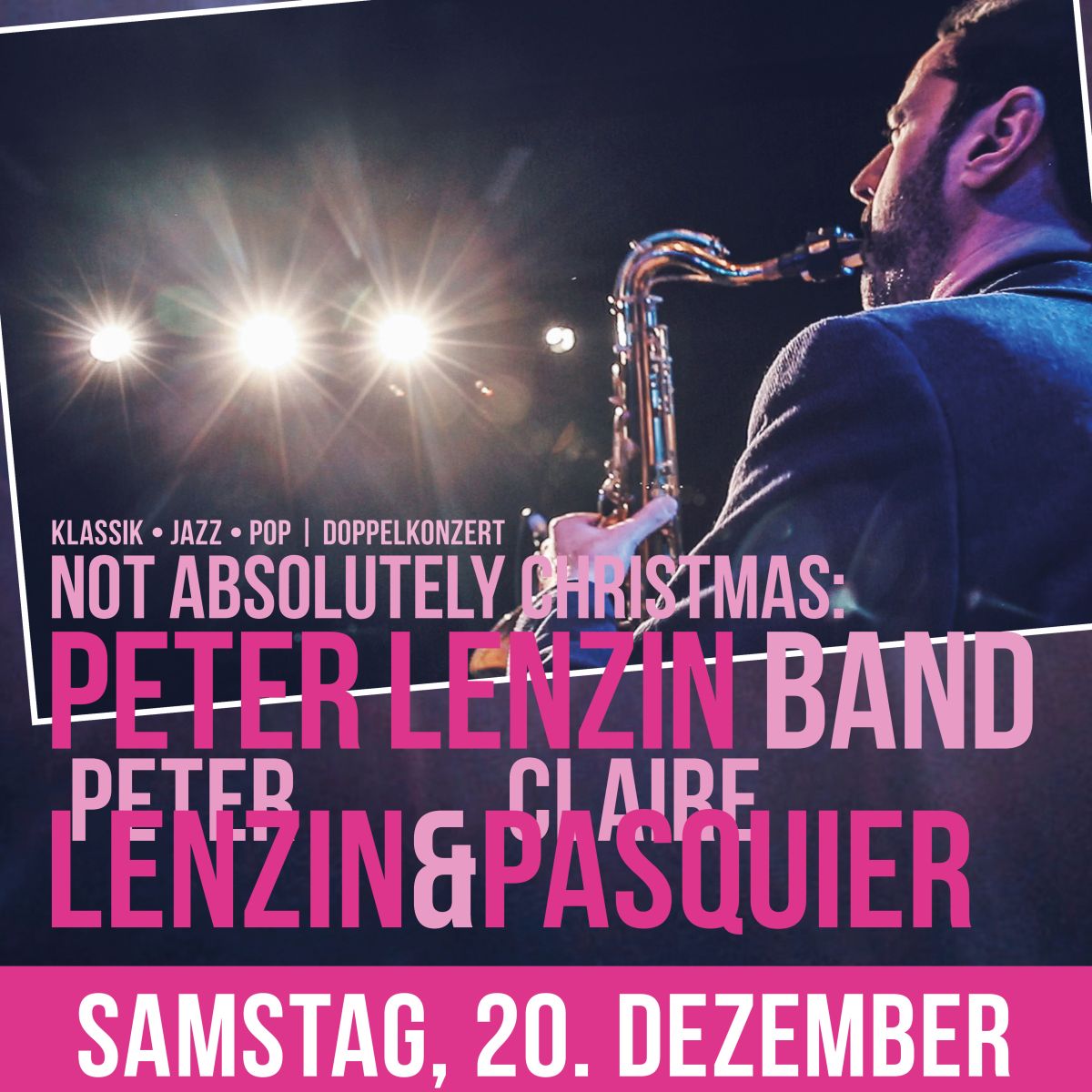 Der Saxophonist Peter Lenzin lädt zu einem stimmungsvollen Doppelkonzert die Pianistin Claire Pasquier ein, um auf meisterhafte Weise klassische Eleganz mit jazziger Leichtigkeit zu verbinden. Anschliessend entführt das Ensemble von Peter Lenzin das Publikum auf eine abwechslungsreiche musikalische Reise durch Jazz, World und stimmungsvolle Christmas Sounds, um zum Schluss und Höhepunkt des Abends gemeinsam mit Band und Pianistin dieses aussergewöhnliche Weihnachtskonzert zu beschliessen!