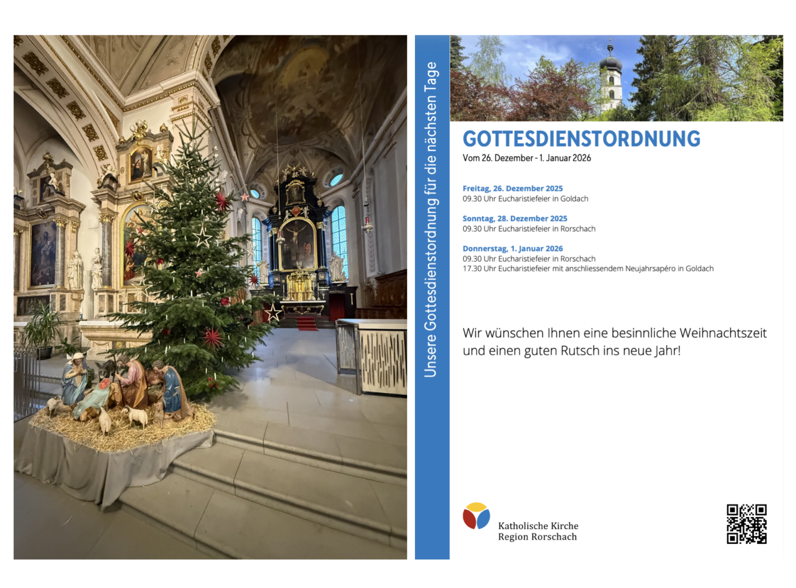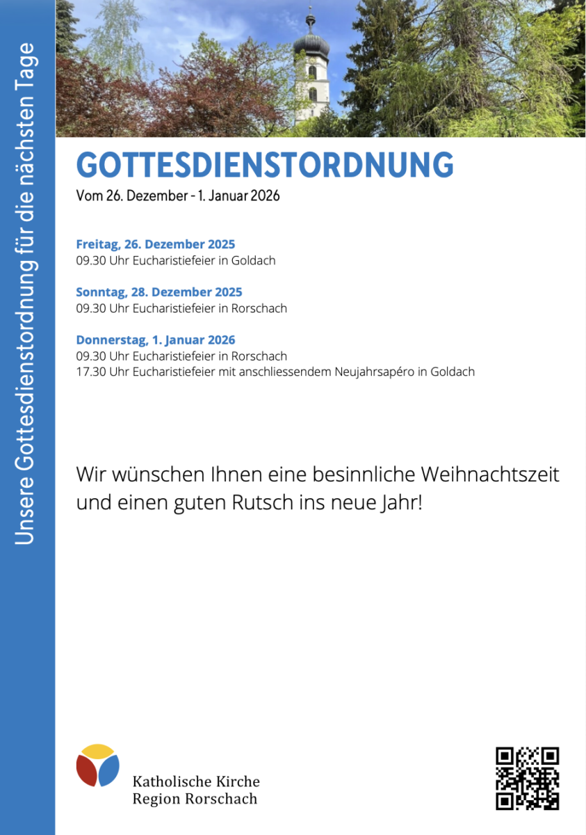 Gottesdienstordnung der KKRR für die nächsten TageThemen:Kath. RorschachKulturPartnerRegionRorschach 26. Dezember 2025 - 05:10Gilt ab heute Freitag bis kommenden Donnerstag, 1. Januar 2026. Mehr Informationen finden Interessierte immer auch hier und hier.Teilen mit: Einen Link per E-Mail an einen Freund senden (Wird in neuem Fenster geöffnet) E-Mail Drucken (Wird in neuem Fenster geöffnet) Drucken Auf Facebook teilen (Wird in neuem Fenster geöffnet) Facebook Auf X teilen (Wird in neuem Fenster geöffnet) X Auf WhatsApp teilen (Wird in neuem Fenster geöffnet) WhatsApp Gefällt mir:Gefällt mir Wird geladen …Newsletter abonnieren Bitte dieses Feld leer lassenBitte wähle, ob Du über jeden neuen Beitrag sofort oder lieber jeden Morgen gegen 9 Uhr eine Zusammenfassung der neusten Beiträge erhalten möchtest.Liste(n) auswählen: Neues vom Echo (Zusammenfassung) Neues vom Echo (Sofortbenachrichtigung) Dieses Feld wird benötigt.Prüfen Sie Ihren Posteingang und den Spamordner, um Ihr Abonnement zu bestätigen.