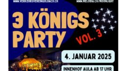 Die 3 Königsparty Vol. 3 startet heute Samstag (04.01.25) ab 17 Uhr im Innenhof der Aula Goldach. Details findet man auf dem Flyer unten.